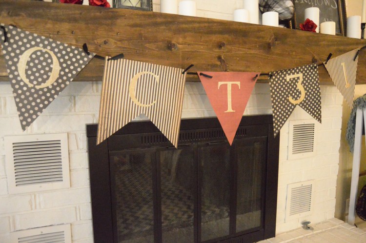 My final scrap book paper project was my Halloween banner for the fireplace. I cut out triangles and flag shapes for the banner then used stencils and more paper to make the letters and numbers. I used some of my daughters leftover school glue stick to put the letters and numbers on. Like I said, on a very tight budget here. Don’t judge.