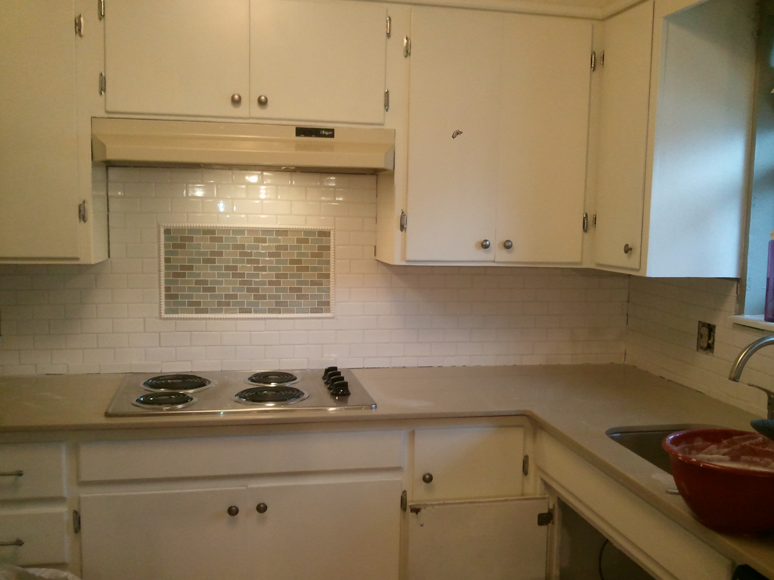 The backsplash in this kitchen was my very first tile job. I found both the small white subway tile mosaic and the colorful accent mosaic above the stove at Lowes. I went to Home Depot and rented a tile saw and purchased the mastic and mortar and got ready to take the plunge. Everything went pretty well until it was time to grout…. DO NOT MIX ALL YOUR GROUT AT ONCE. I REPEAT, DO NOT MIX ALL YOUR GROUT AT ONCE. I was literally in tears at the end of this tile job. Lesson learned and my future tile projects went a lot smoother when it came to grout. I learned a lot from this first tiling project. Most of my lessons learned seem like common sense now, but you gotta start somewhere right?! For instance, if you are using a wet tile saw, set up outdoors. They are MESSY! And once I was done, so was my kitchen. I also learned that your quartz countertops are pretty impervious to damage but stone is their kryptonite. Cover them well before you tile your backsplash. Thankfully I didn’t have to learn that the hard way. The installers gave me a heads up! Thank you Lowes countertop installer guys!
