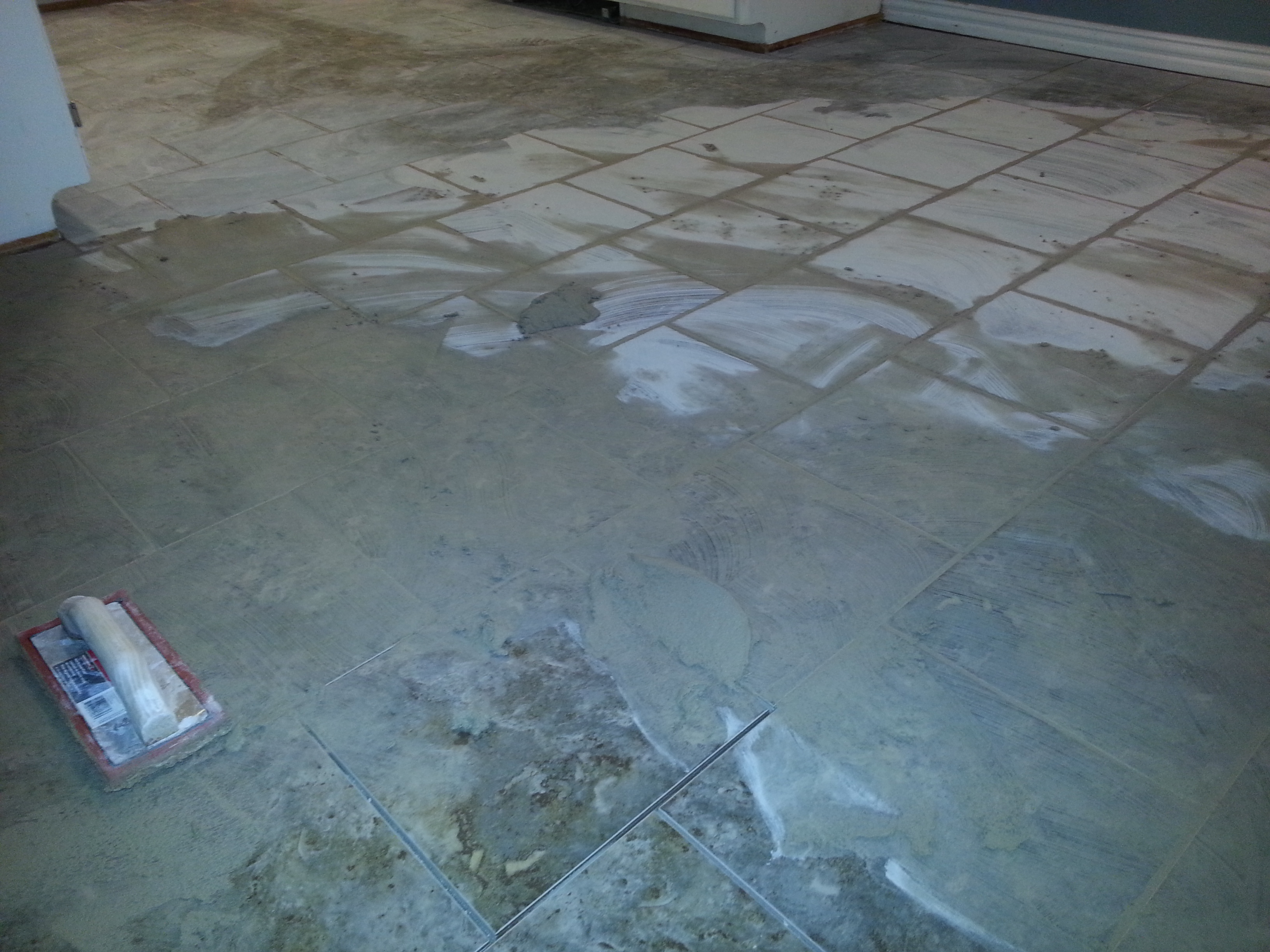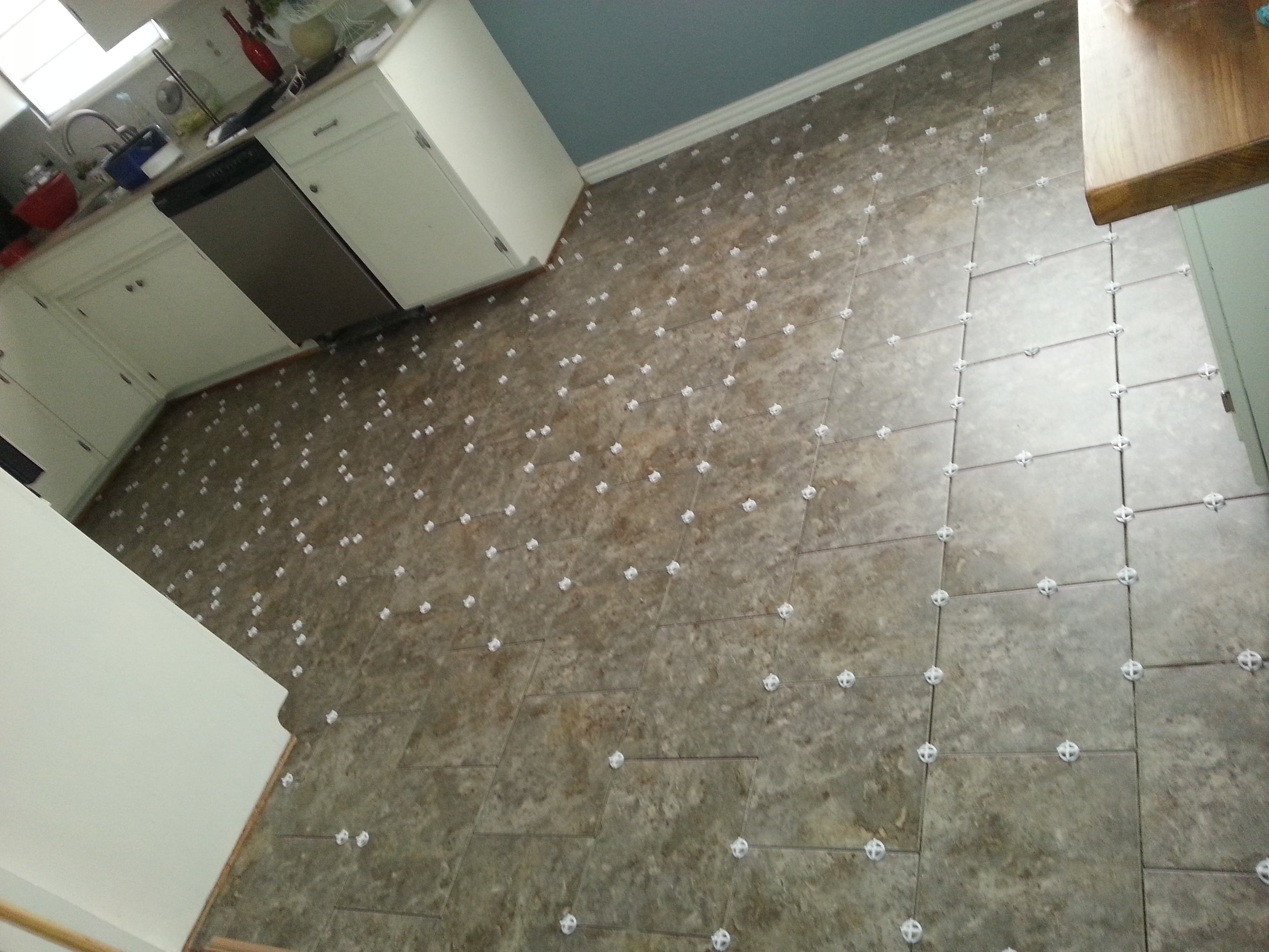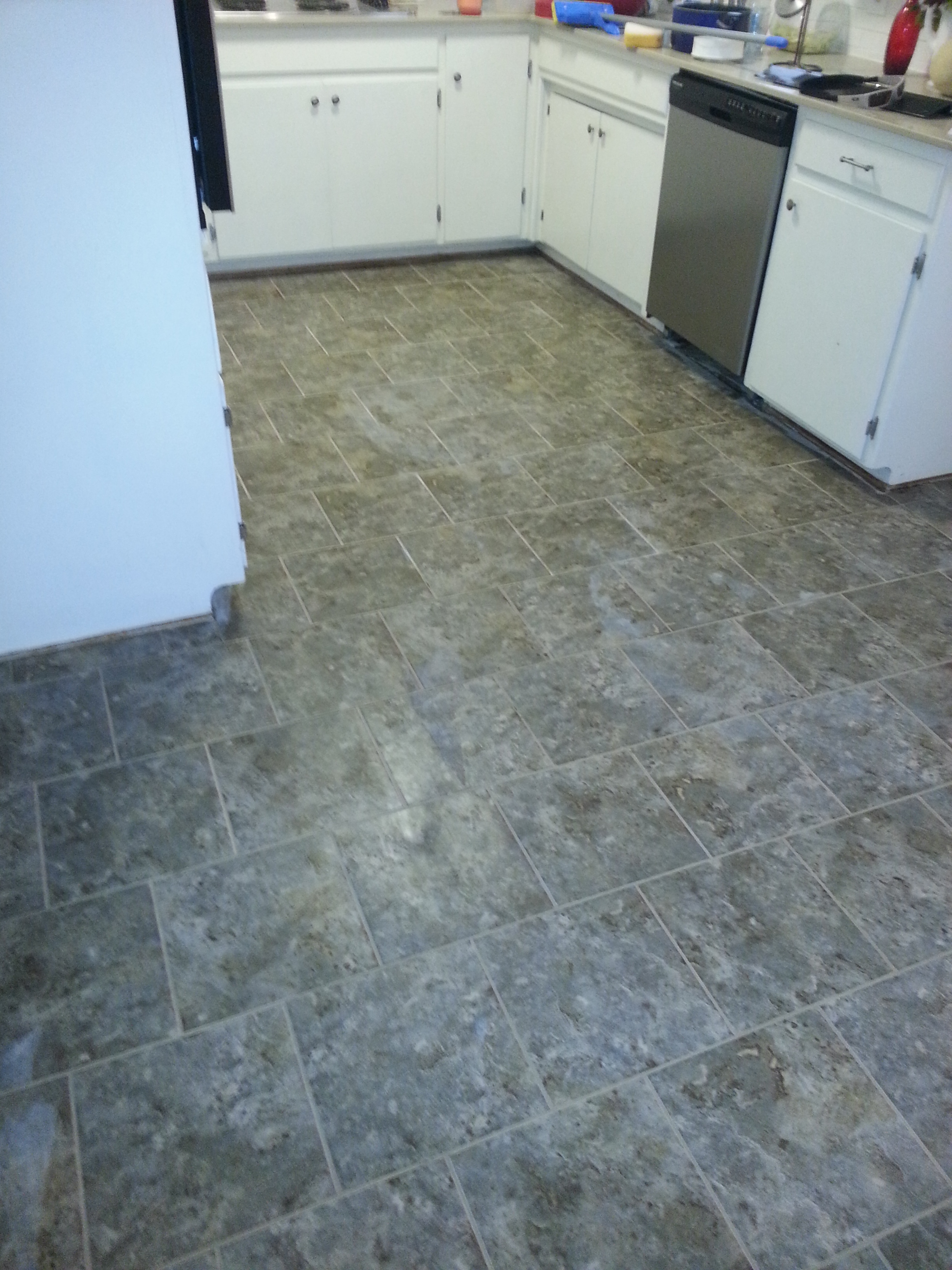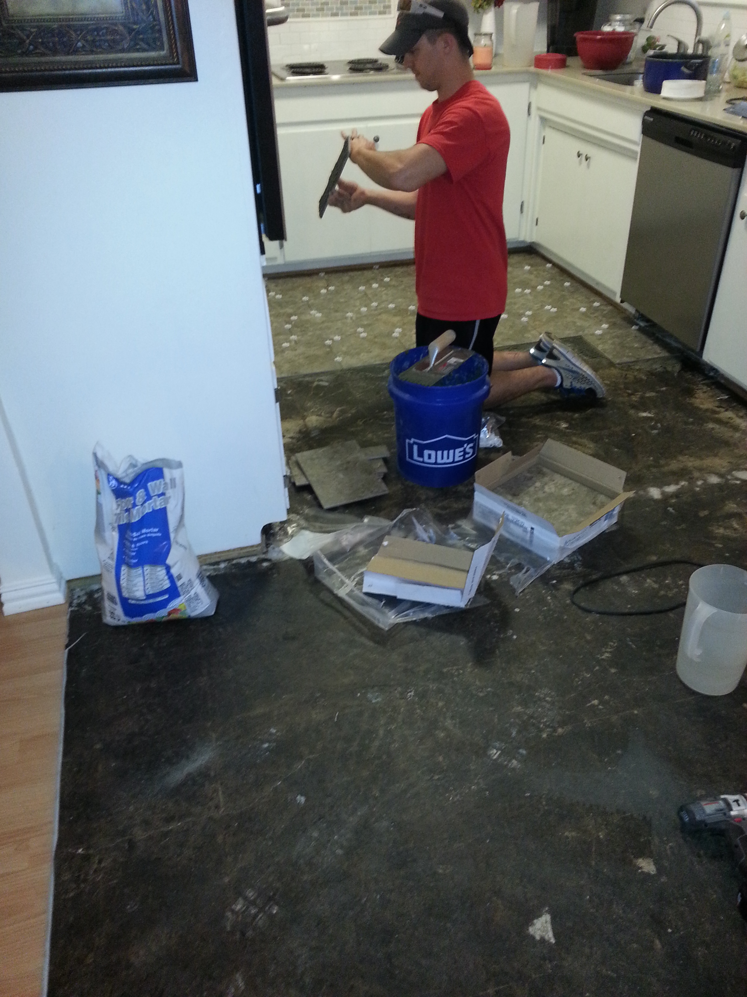 The floor was something we contemplated for a while. We knew the laminate that was there had to go, but weren’t sure if we wanted the new floor to go throughout the entire home or not. We decided to go with tile for the kitchen and lay it all the way to the bar since it seemed so disconnected from the rest of the kitchen. I thought this would make the kitchen feel larger and boy was I right! Not to toot my own horn haha, but it did exactly that. We chose a low cost ceramic tile with a mixture of browns, blues and greys. My husband helped me with this project. Thank God for handy husbands who are willing to help their crazy, pregnant, DIY obsessed wives. Yes, I was pregnant at this time and helping my husband tile. Don’t worry, he did all the heavy lifting. I mostly added spacers and helped cut the occasional tile.