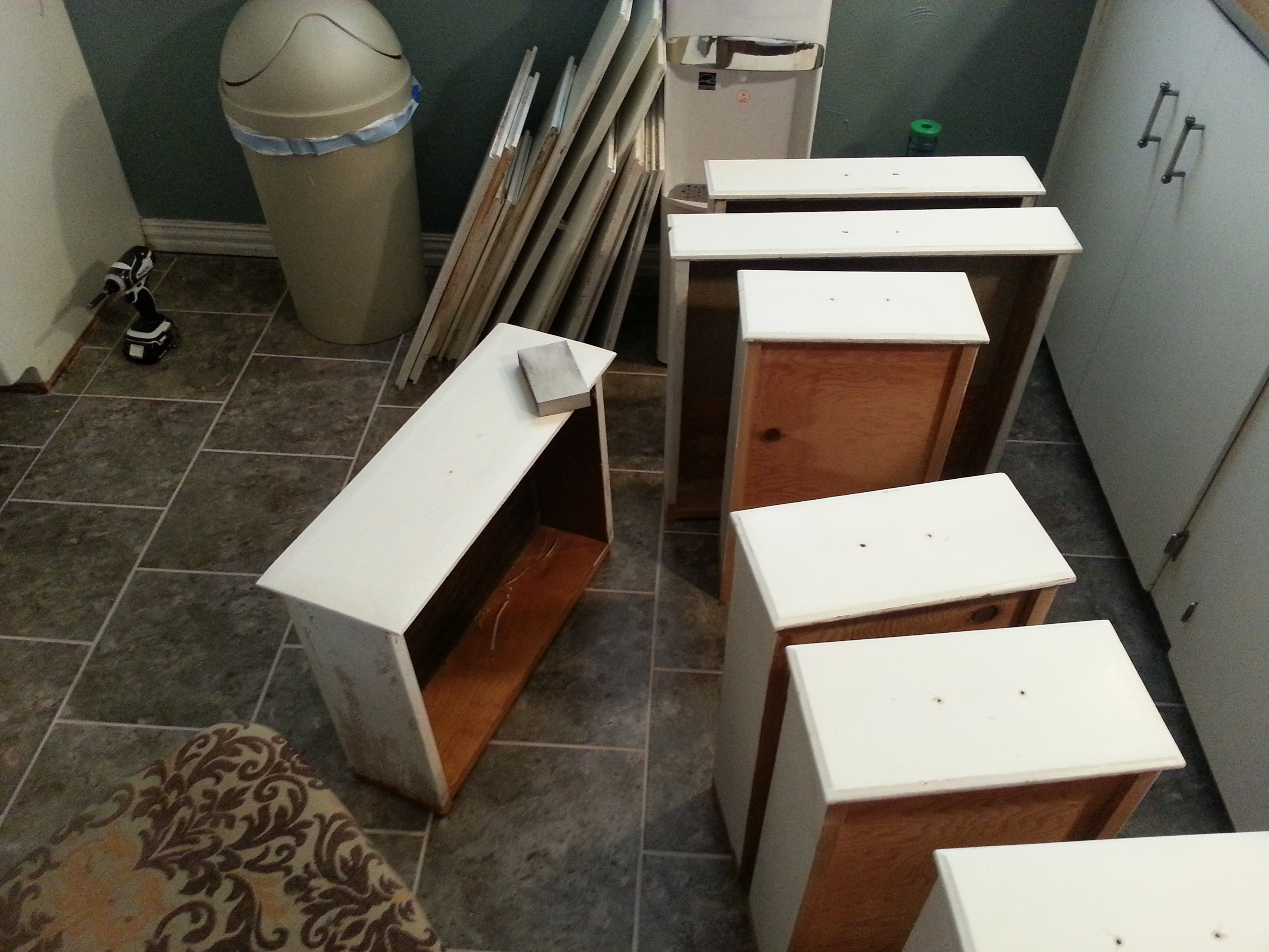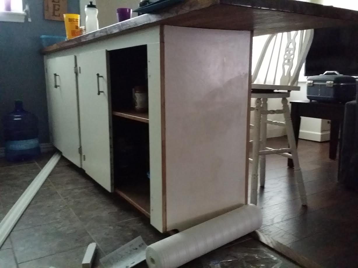 I was pretty happy with how the bar turned out so there was no question I was going to do the rest of the kitchen cabinets. It took me about 3 weeks to complete. The only difference between the bar and main kitchen cabinets is the baseboard. I could not use traditional baseboard because the space where for the toe kick was too big for the 3″ board and too small for the 4″ board. I improvised using MDF board and window trim. I used more 2×4 to attach the MDF and trim under the cabinets.