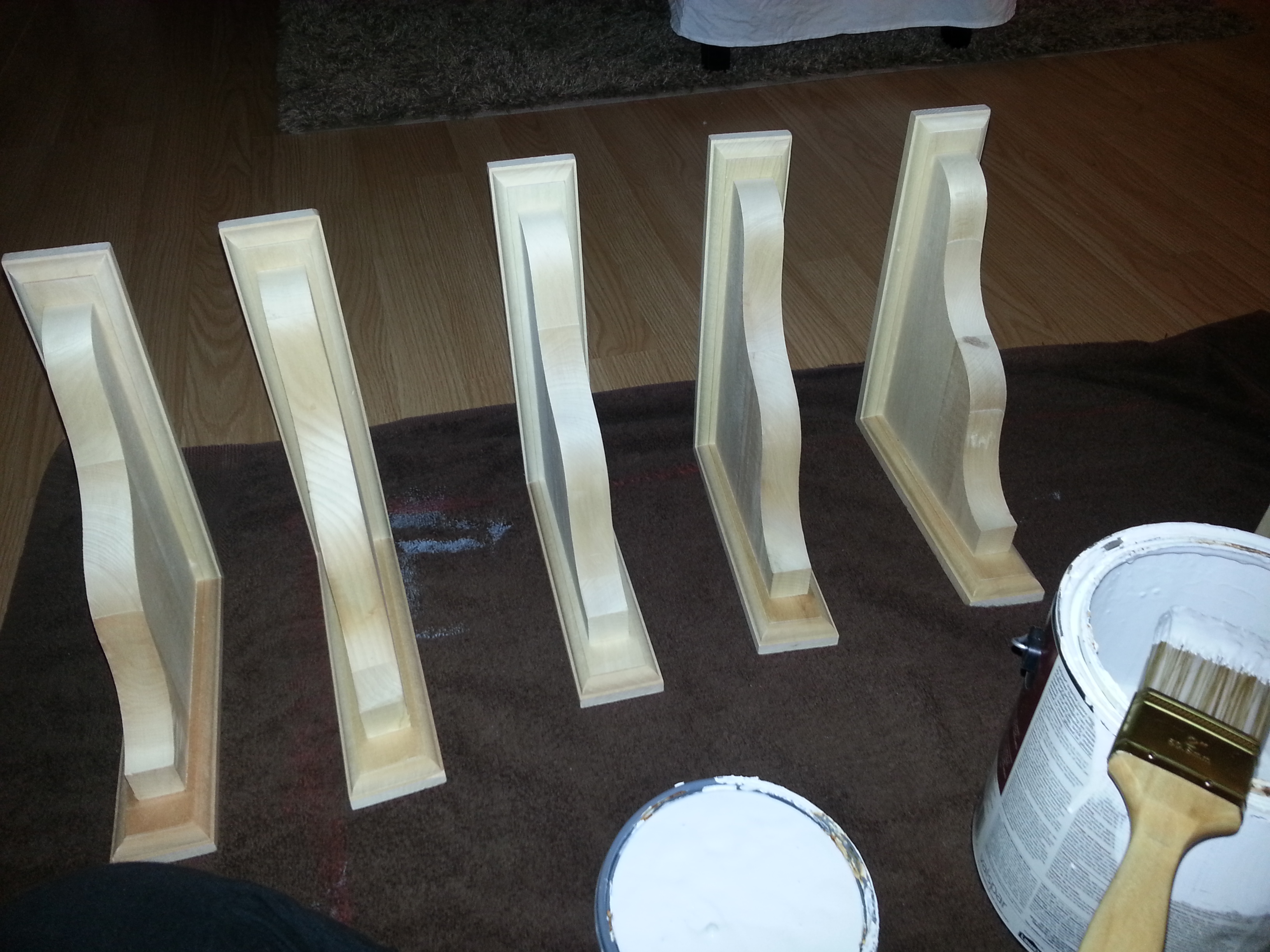 But that wasn’t enough character for me. I wanted to add corbels under the top cabinets so they look more like custom cabinetry. I found some I liked at Home Depot for a great price. They were raw wood so I gave them a coat of Zinsser primer and white paint then put them up. I used finishing nails to attach them to the underside of the cabinets and glued them with construction adhesive to the tile backsplash. They are simple but add so much character.