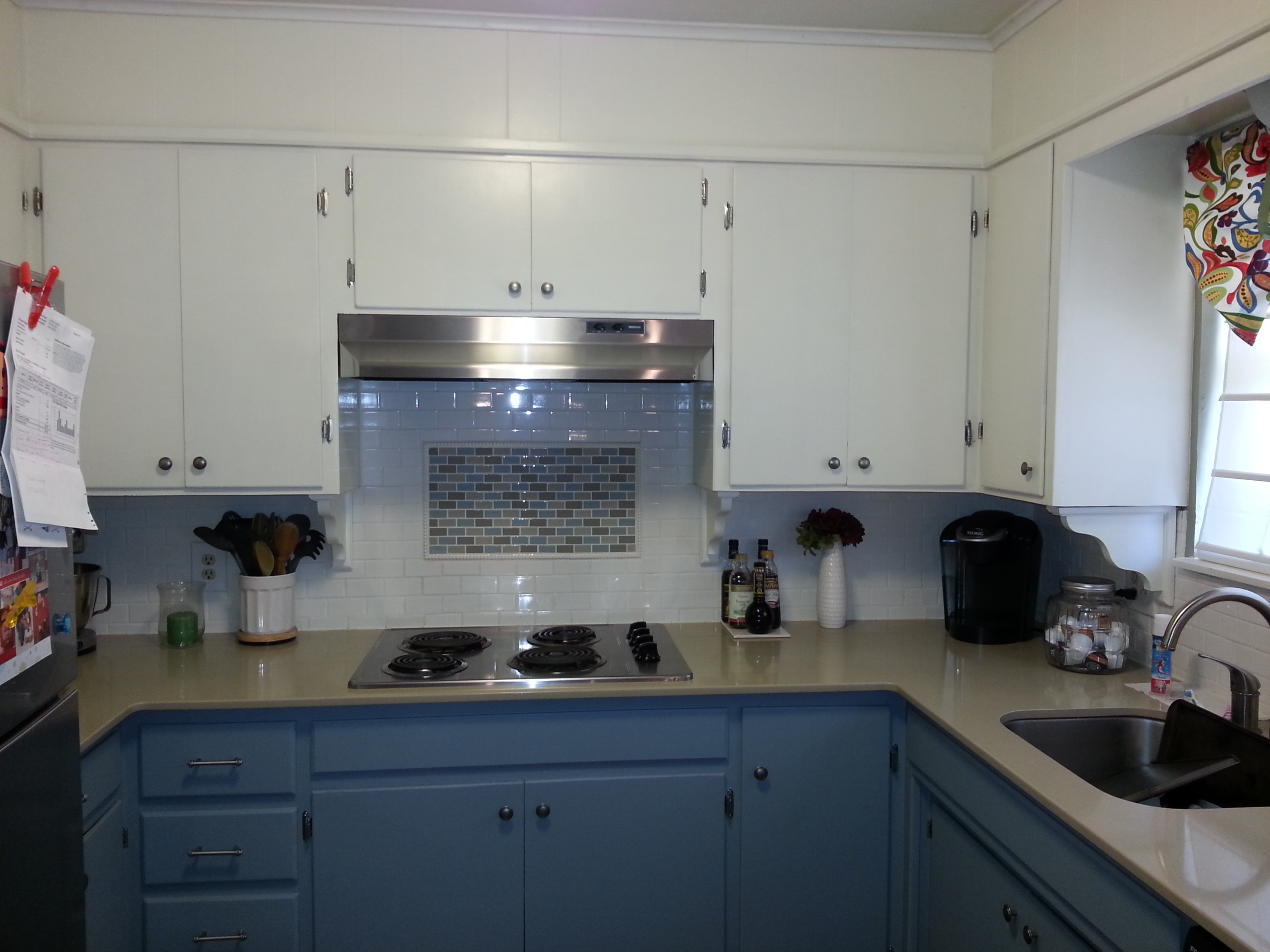 Next it was time for style and details. I was determined to make this original 60s kitchen look beautiful and fresh and up to date. I like a white kitchen, but it was just not working for me here. I convinced my husband some of the white had to go. I had bought this blue paint when we first moved in and used it for an accent wall. I love it! It is such a calm, pretty blue. Since I had 2 extra gallons and it already matched so much of my décor, we went with it. It turned out great and compliments the counters so well!