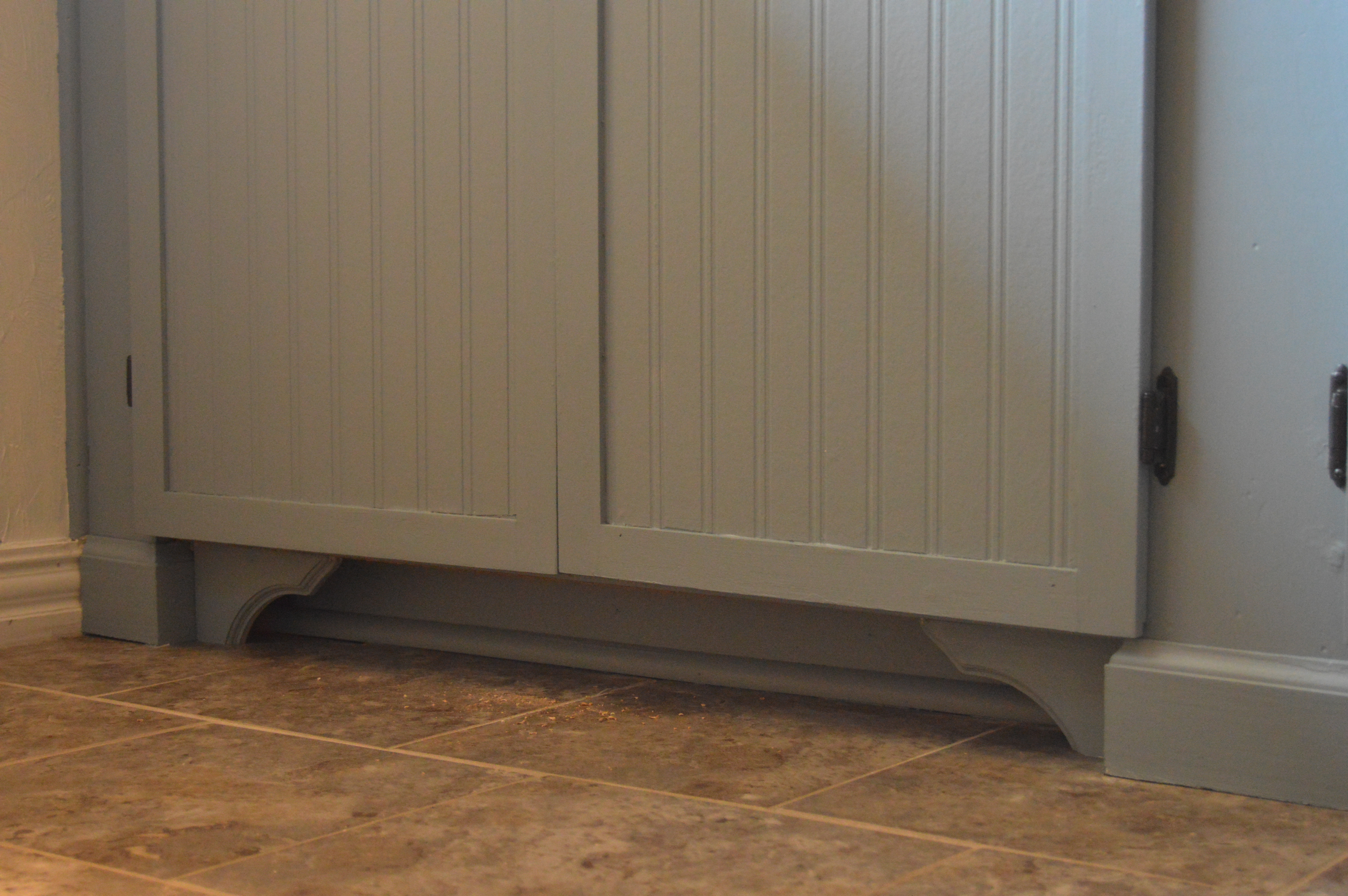 The feet are actually shelf brackets from Lowes that I cut to fit under the cabinet and also have a flat bottom to sit on the tile floor. I also removed the little brackets.