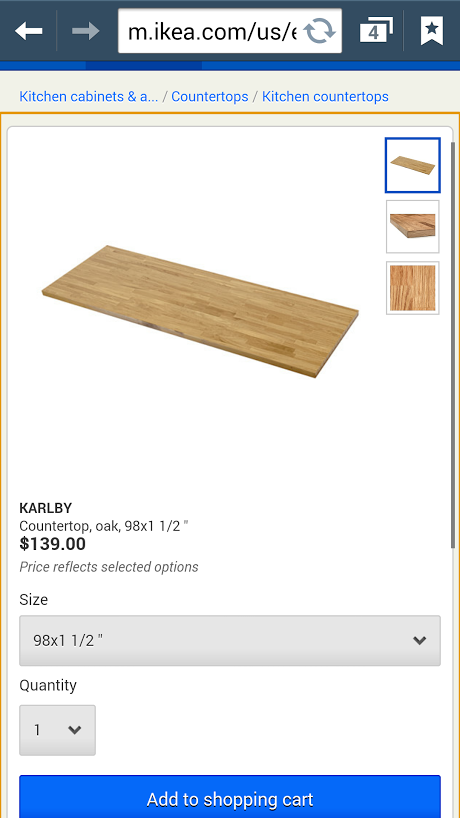 We did not purchase quartz for the bar top. Instead I chose a butcher block counter from IKEA. I found it online so we took a trip to Dallas to check it out in person. We chose this one and hauled it home.