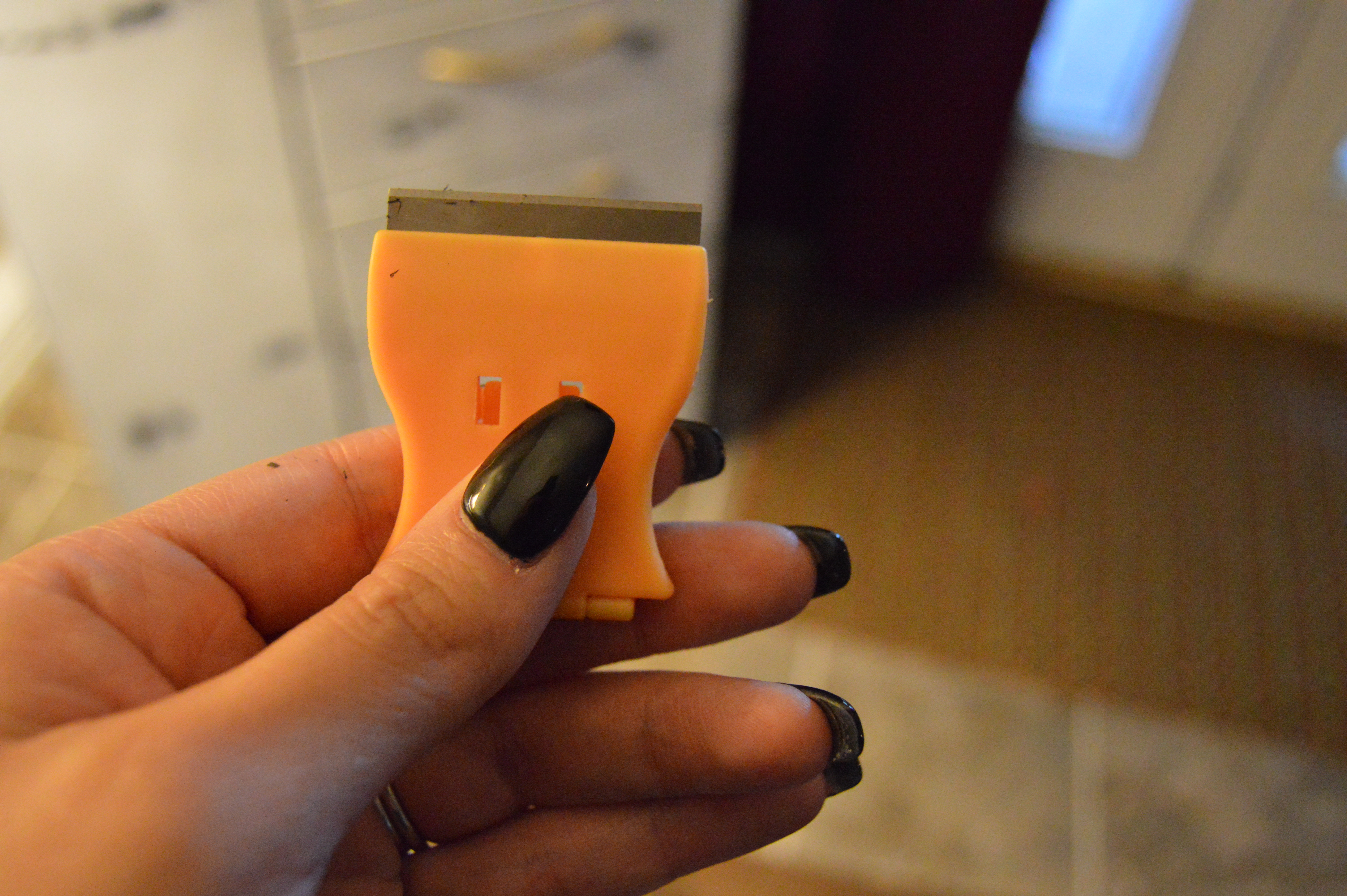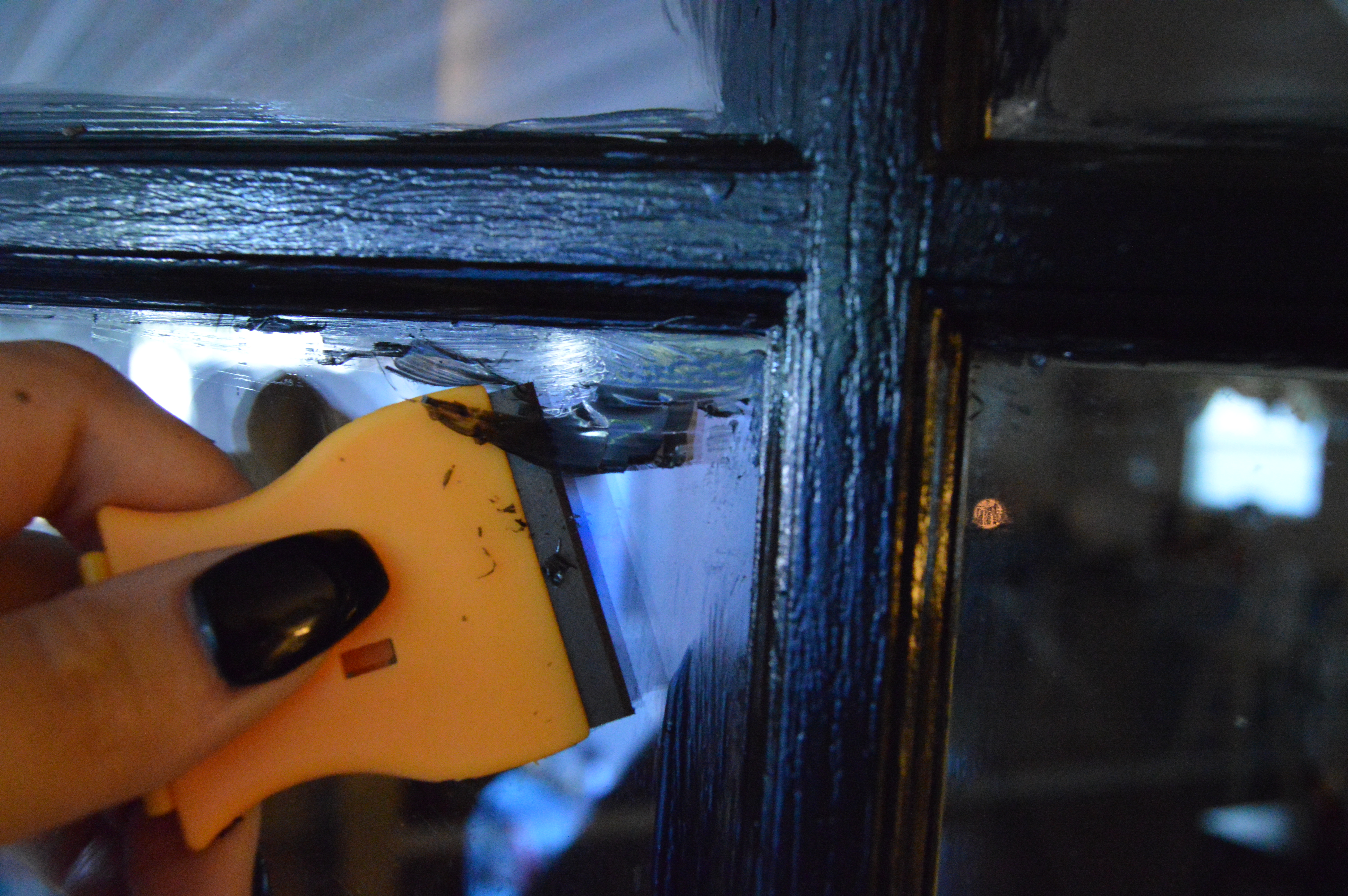 The majority of my time was spent on the door. It took 3 coats to get it covered completely. I used a high gloss paint because I wanted a lacquer look. The glossy finish had trouble sticking to my metal door. I opted not to tape off the window panes because it would take too long and I would probably still get some paint on the windows. Instead I just painted right over them and use this handy window scraper to get the extra paint off. It worked the a charm. make sure you use a razor blade to cut around each pane first so you don’t peel the paint off your door.