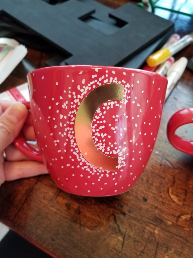 First, I removed the sale stickers and cleaned the mugs. Then, I placed a sticker letter on the front of the mug. You can measure to make sure it’s even, but I just eyeballed it.