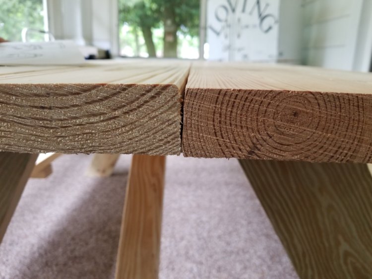 Then, he put the seats on. Most of the holes were pre-drilled, but when he got to the seats, he needed to pre-drill a couple of the holes. Make sure your benches are evenly placed and the boards are flush, then pre-drill.