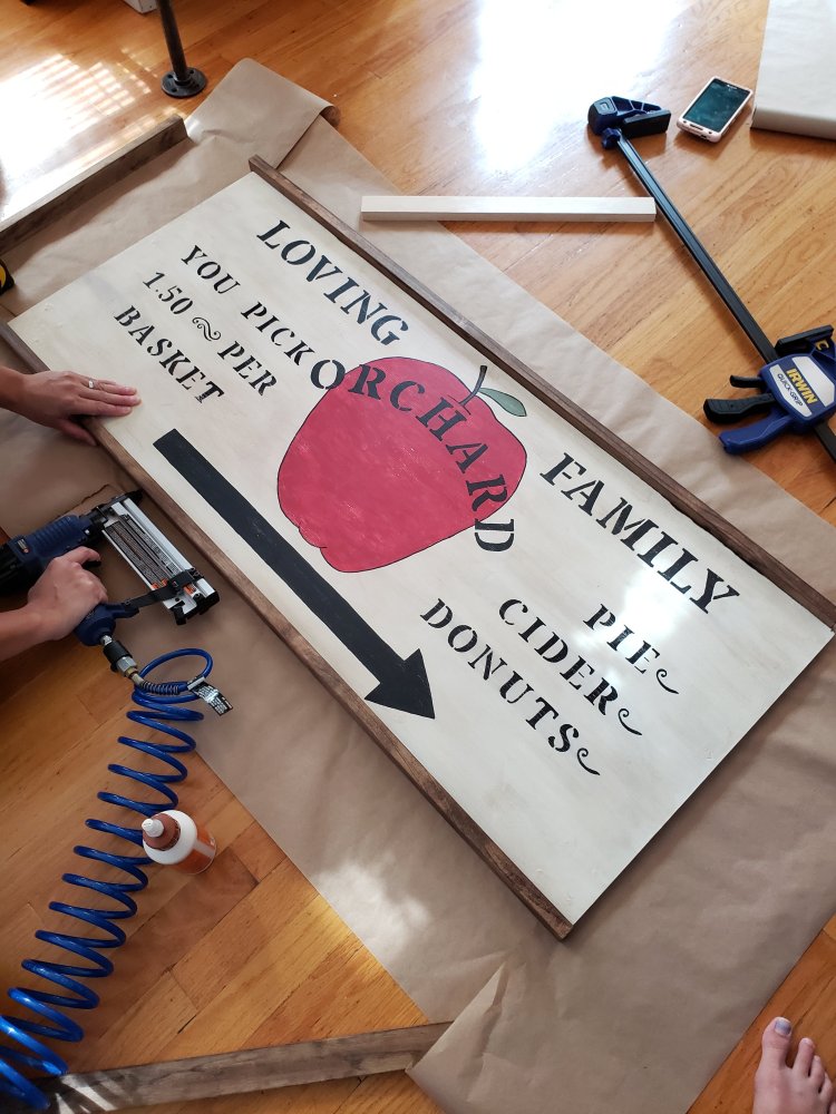 I have a big empty space on a bare wall in the dining room that has been screaming at me for some decoration. Since I was already planning on decorating for Fall, I figured now would be a good time for a DIY Fall sign. Apples are my fall theme this year so I made an apple orchard sign.