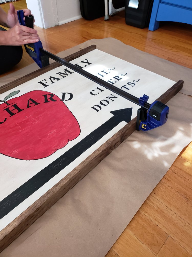 Liberally apply your glue, then attach to your sign and hold with wood clamps while you nail your pieces to the sign. Finishing nails are great, but it’s the wood glue that does most of the work. If you don’t have clamps or in my case, clamps that weren’t long enough, you can use an extra set of hands while you nail your frame in place.