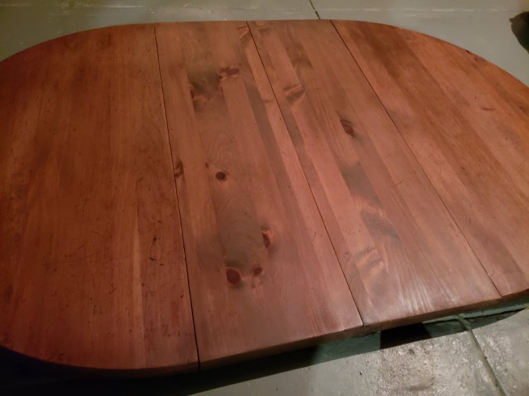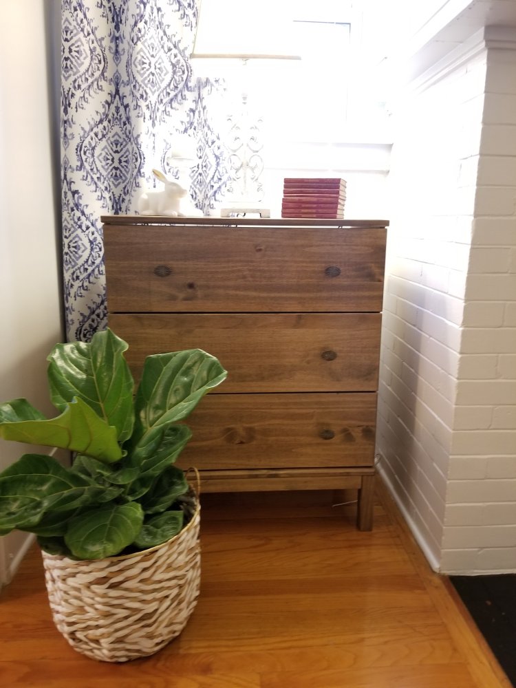 I should have left it alone after I put the Weathered Oak stain on it. If you remember I told you that I was trying to achieve the same stain as the Ikea Tarva dressers in the living room. I used the Weathered Oak first, then Red Oak to get that look. Here is the table after the weathered oak