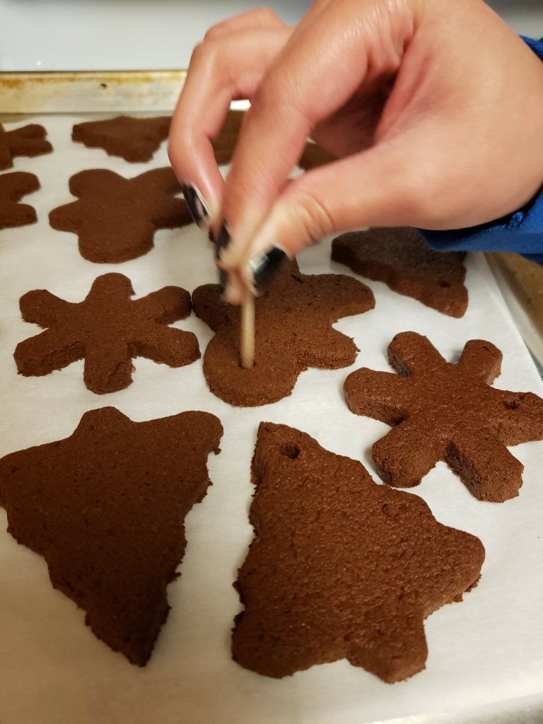 Use your favorite cookie cutters to make your ornaments. Put them on a baking sheet lined with parchment paper. Use a toothpick to create a hole on top for the ornament hook or ribbon.