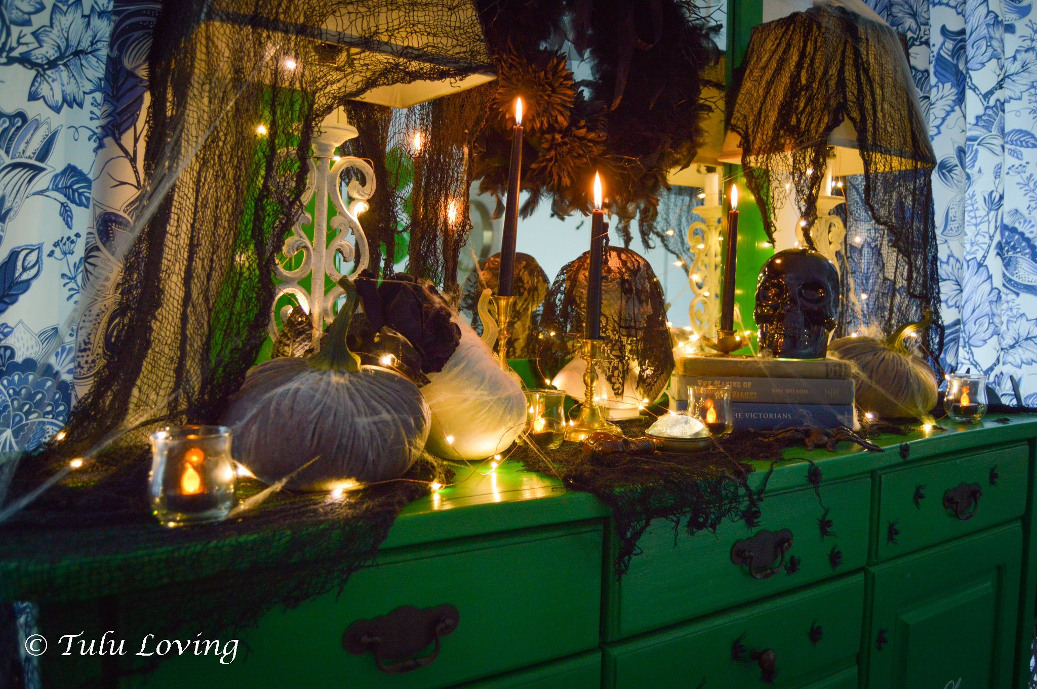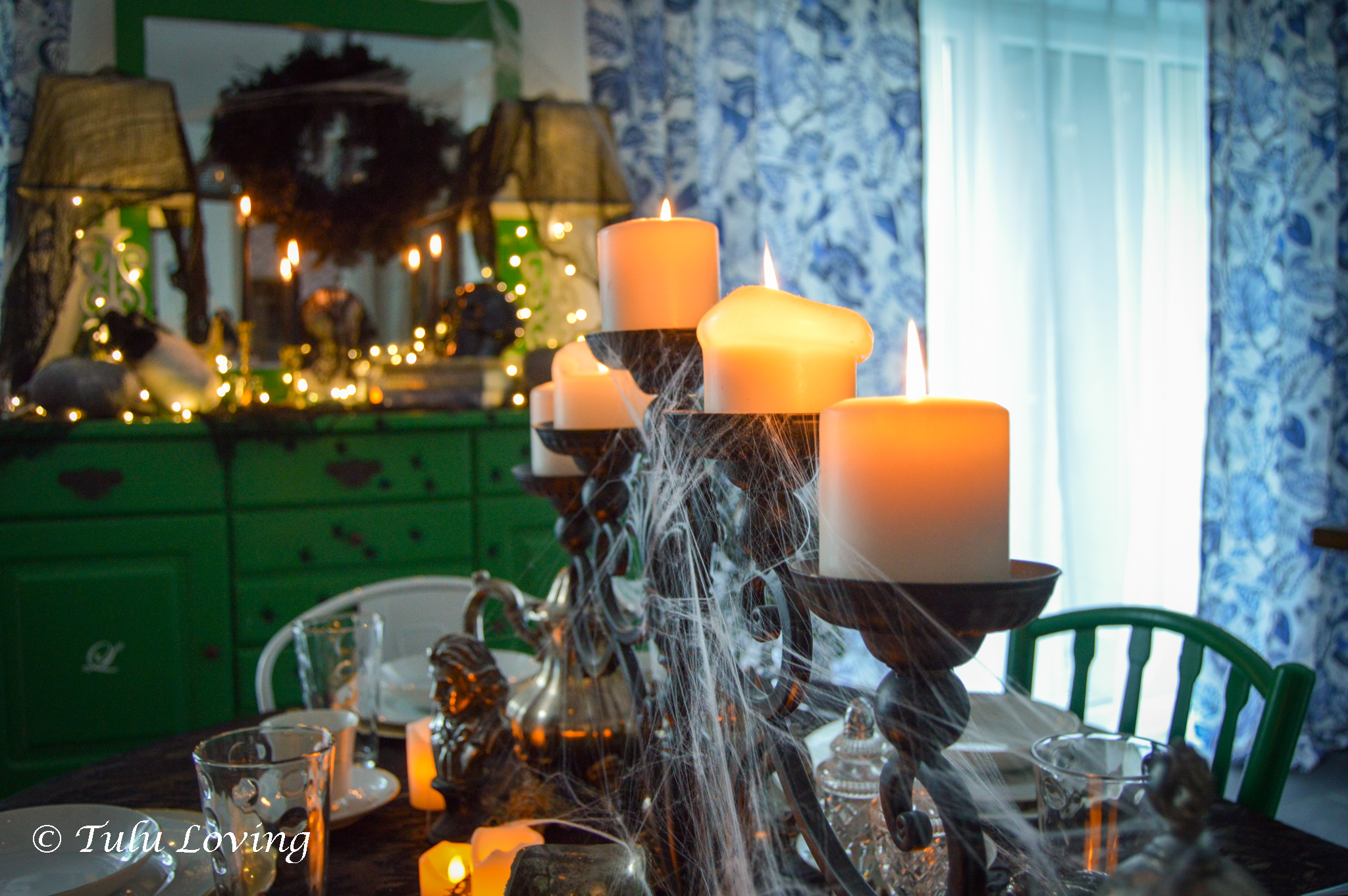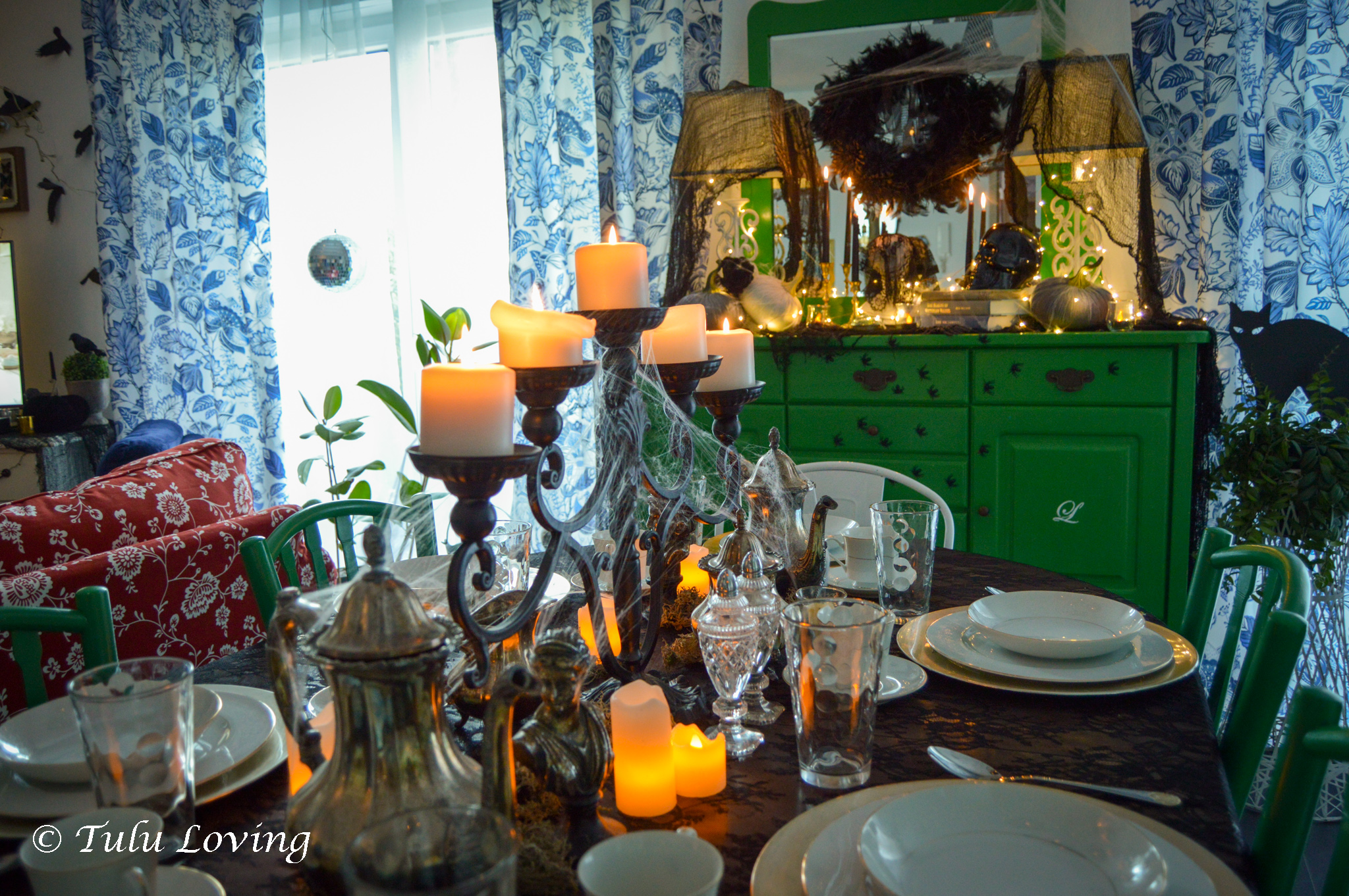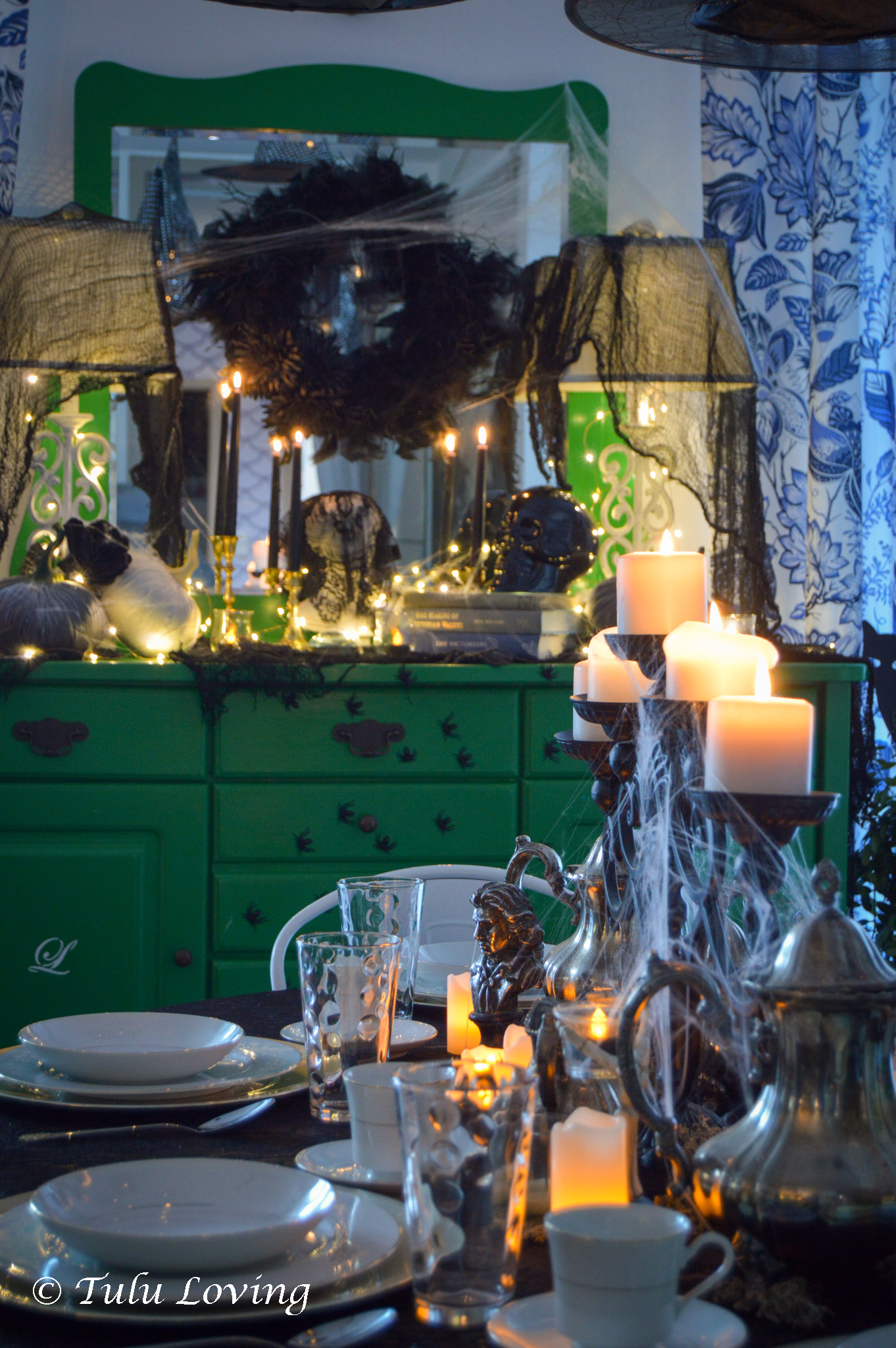 The second room in this Halloween tour is my favorite. The dining room reminds me of a haunted mansion. I added lots of lights and candles to make it feel vintage and moody. Let the lady of the house take you in….