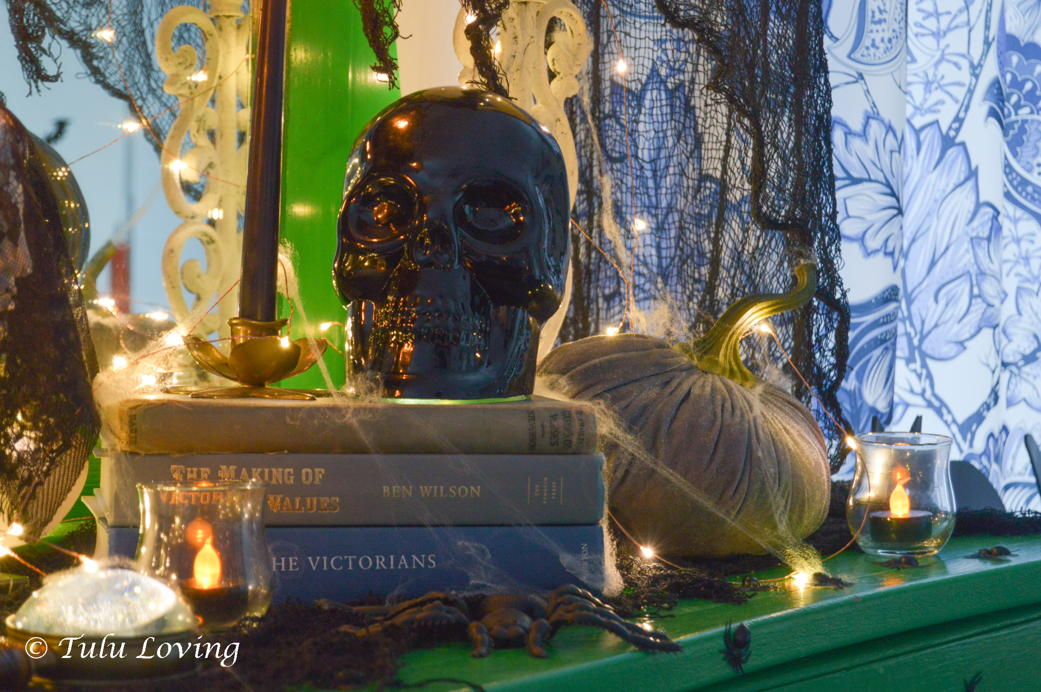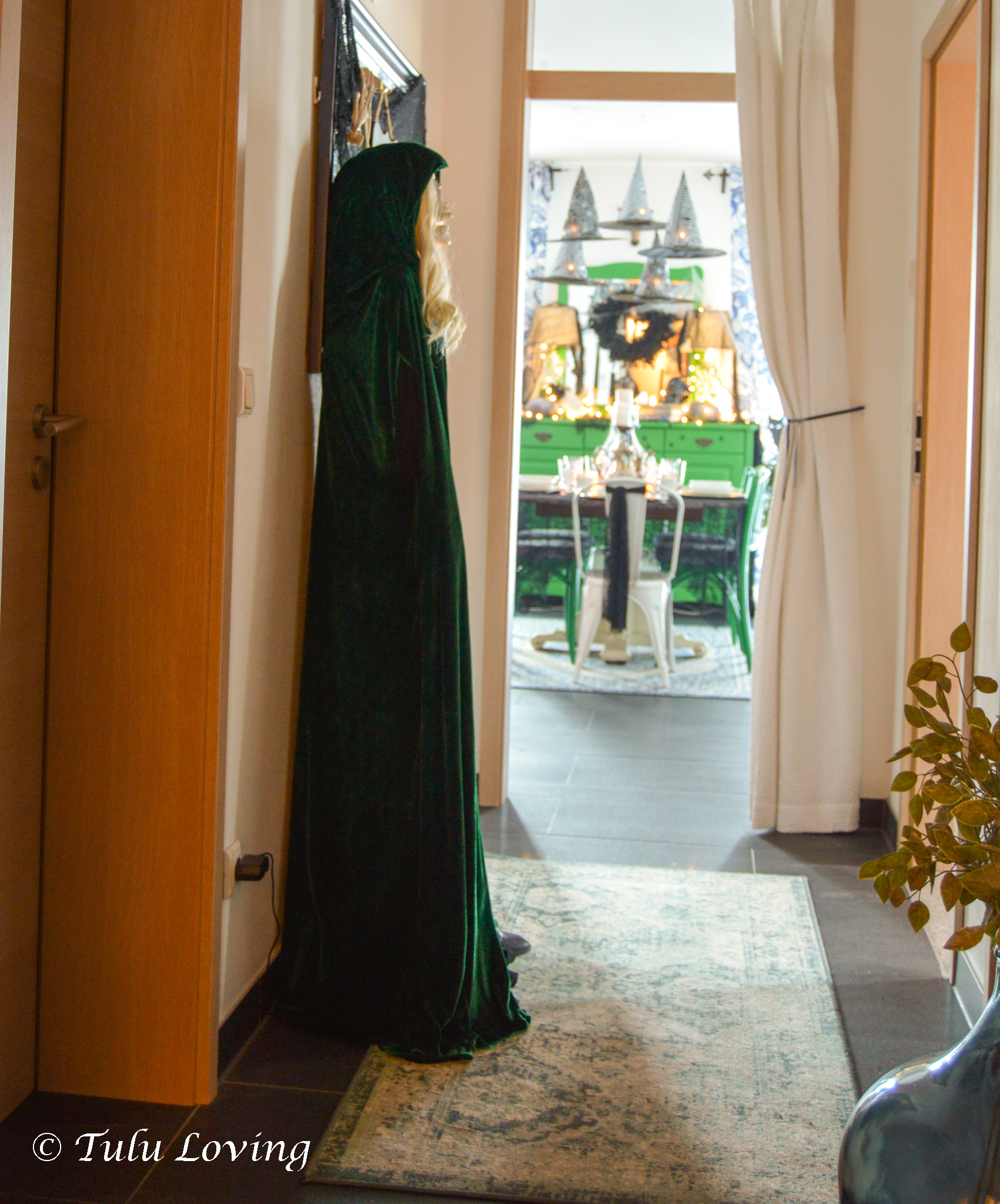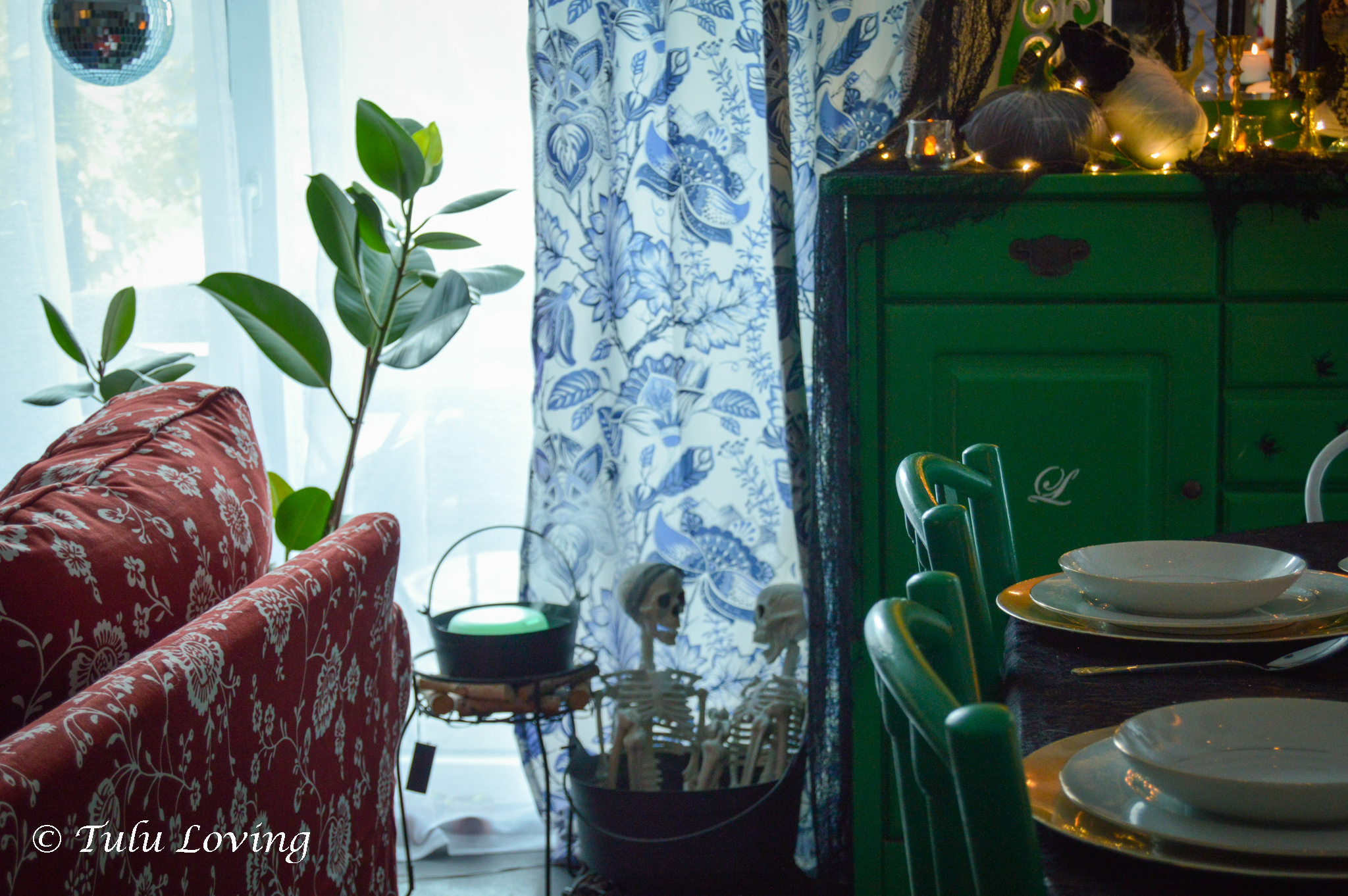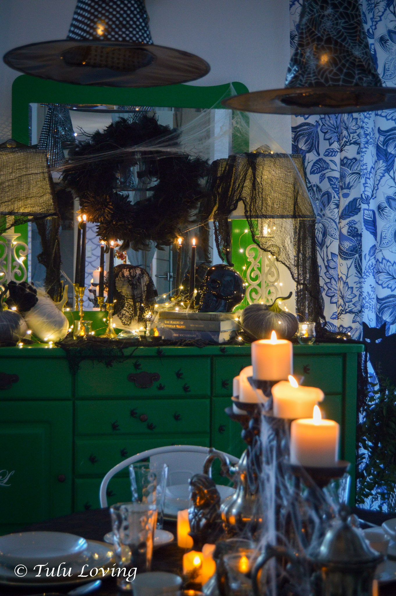 The second room in this Halloween tour is my favorite. The dining room reminds me of a haunted mansion. I added lots of lights and candles to make it feel vintage and moody. Let the lady of the house take you in….