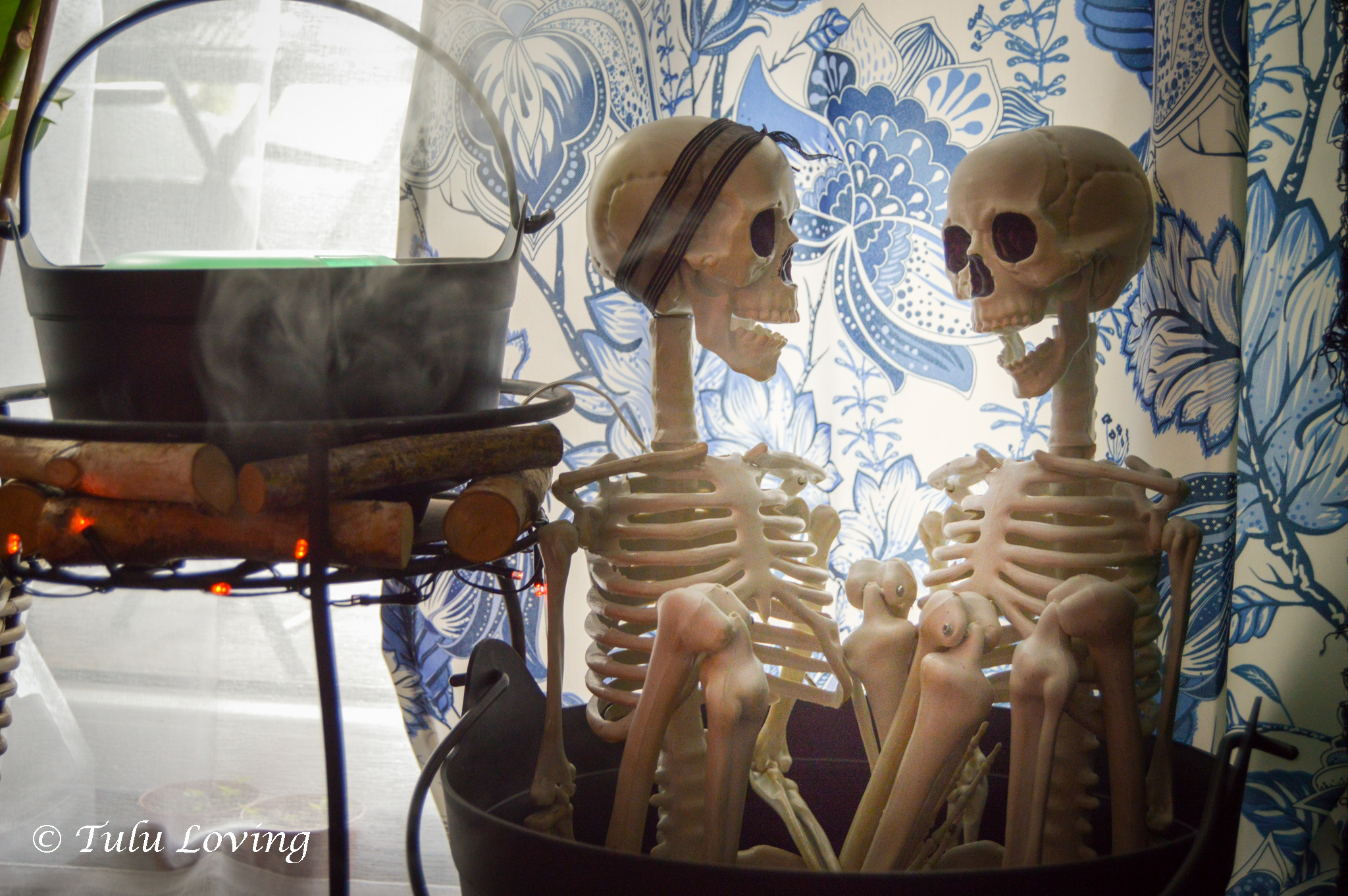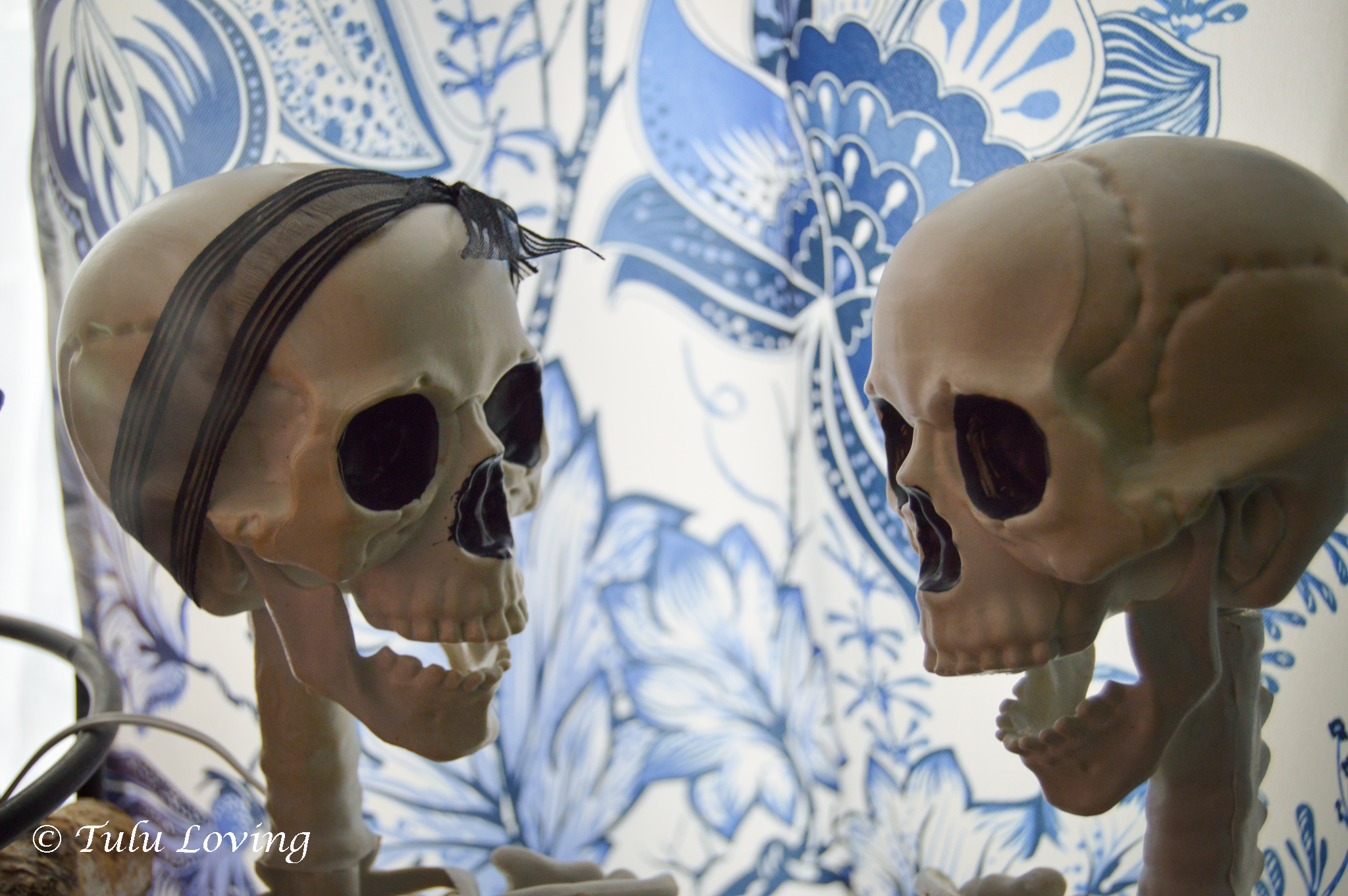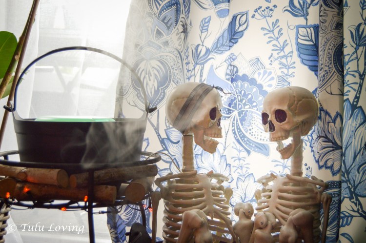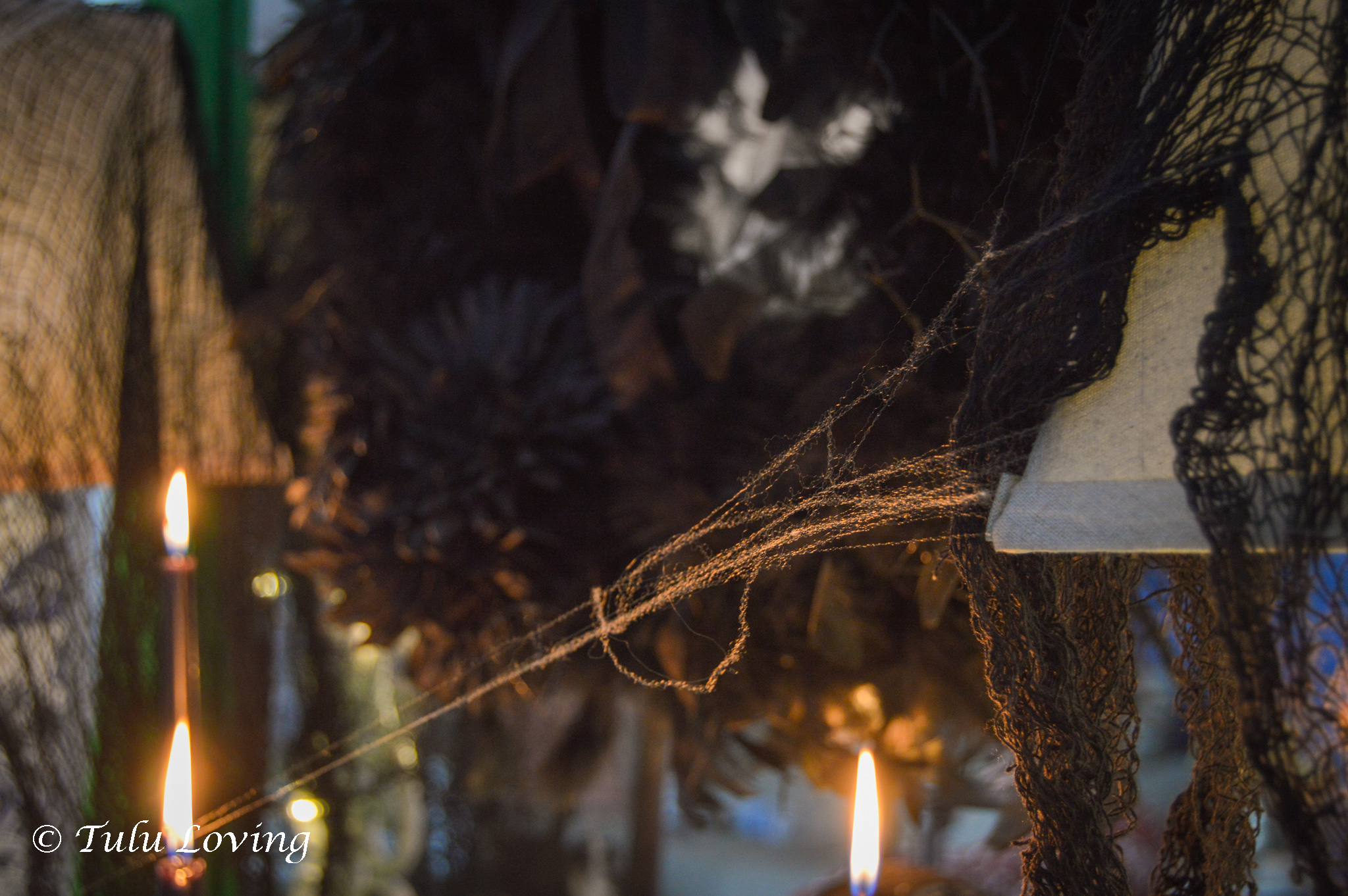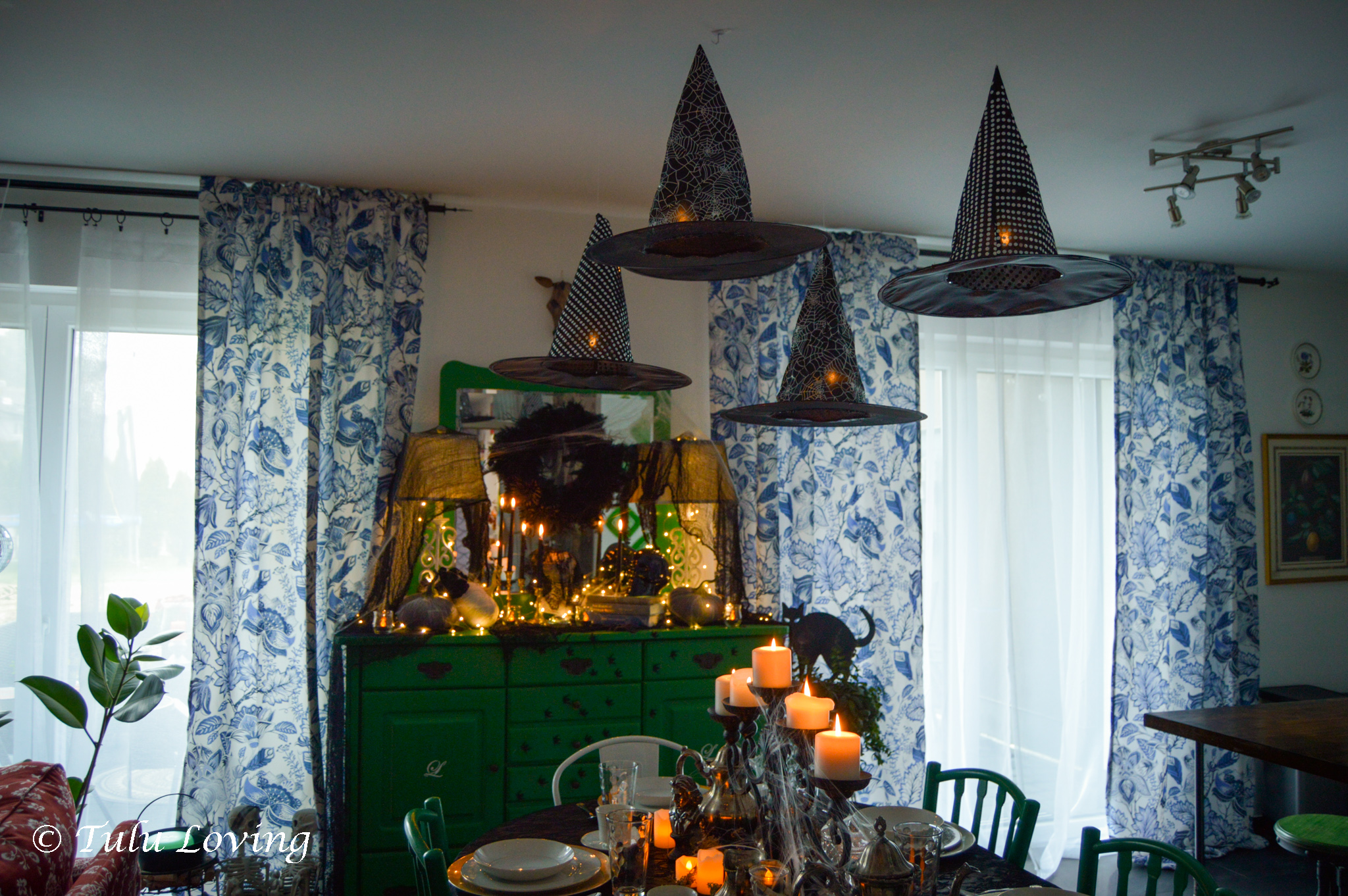 The second room in this Halloween tour is my favorite. The dining room reminds me of a haunted mansion. I added lots of lights and candles to make it feel vintage and moody. Let the lady of the house take you in….