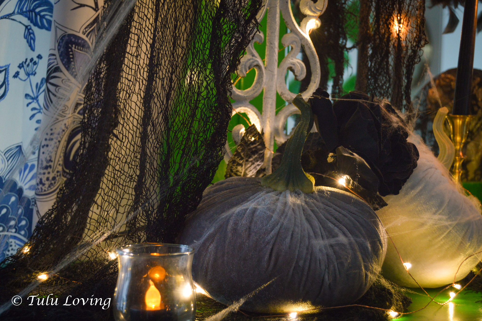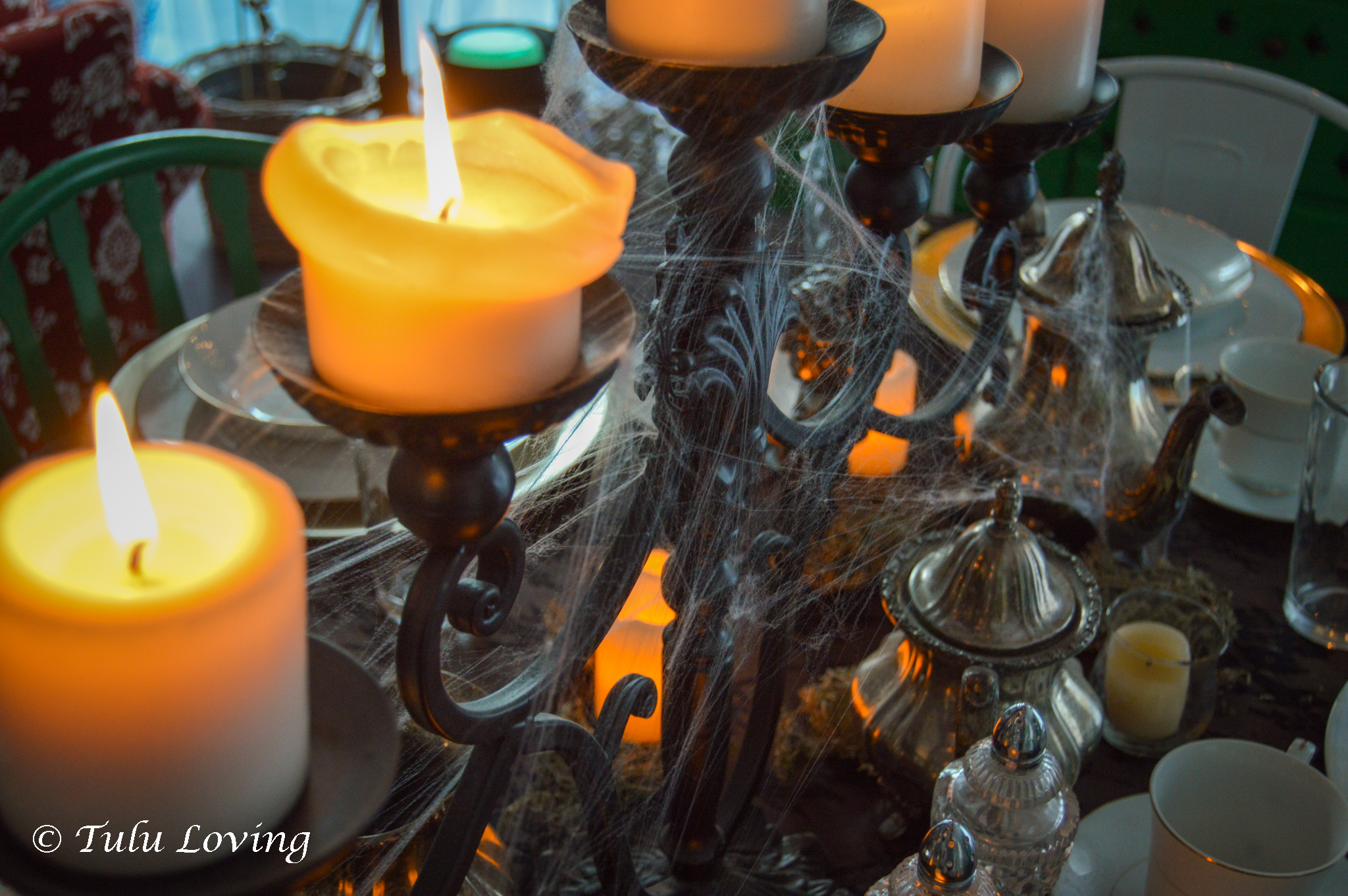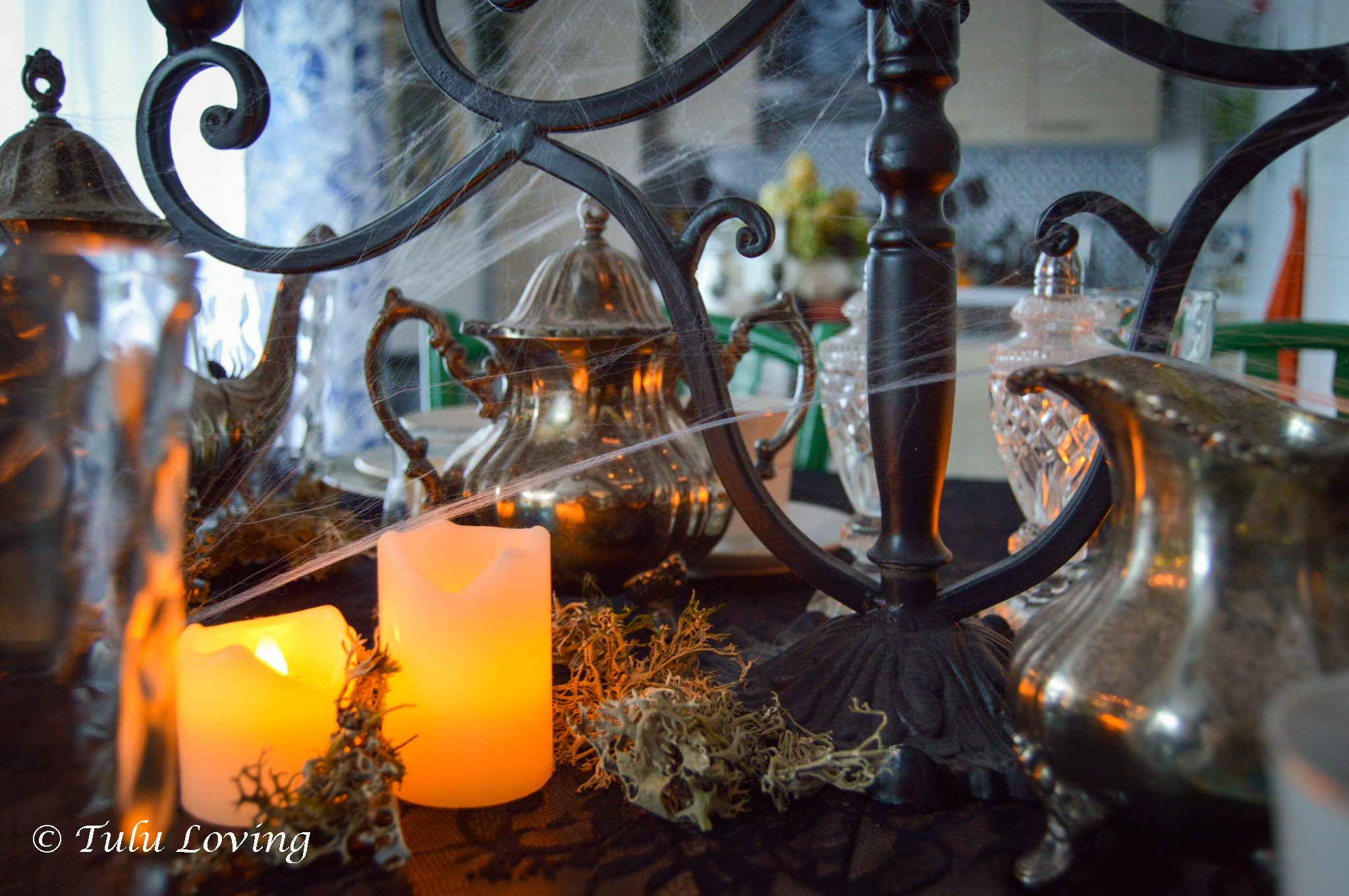 I used some of my thrifted crystal and silver pieces on this haunted tablespace.