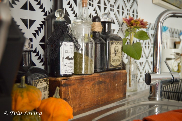 Day 3 of the Halloween tour explores our tiny kitchen. Jordan and I have come to realize that the kitchen is our Achilles heel. We have bad luck finding a good kitchen in our rental homes. This one is no different, but with some additional cabinetry and a DIY island, we have made it work. For Halloween I’ve added an apothecary and some DIY artwork. I’m going to have to use my imagination while I’m here because they do not celebrate Halloween the way we do. My options are limited to mostly the base exchange. But, enough of my decorating woes, let’s check out the kitchen.