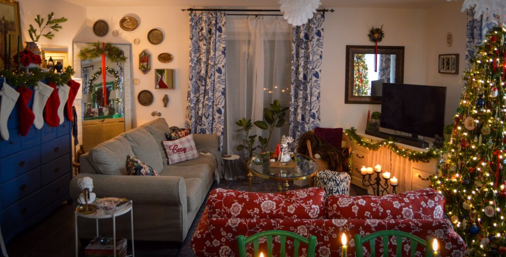This view makes me so happy because the new to me vintage persian rug makes the Christmas decorations fit so seemless into the everyday look of this room.