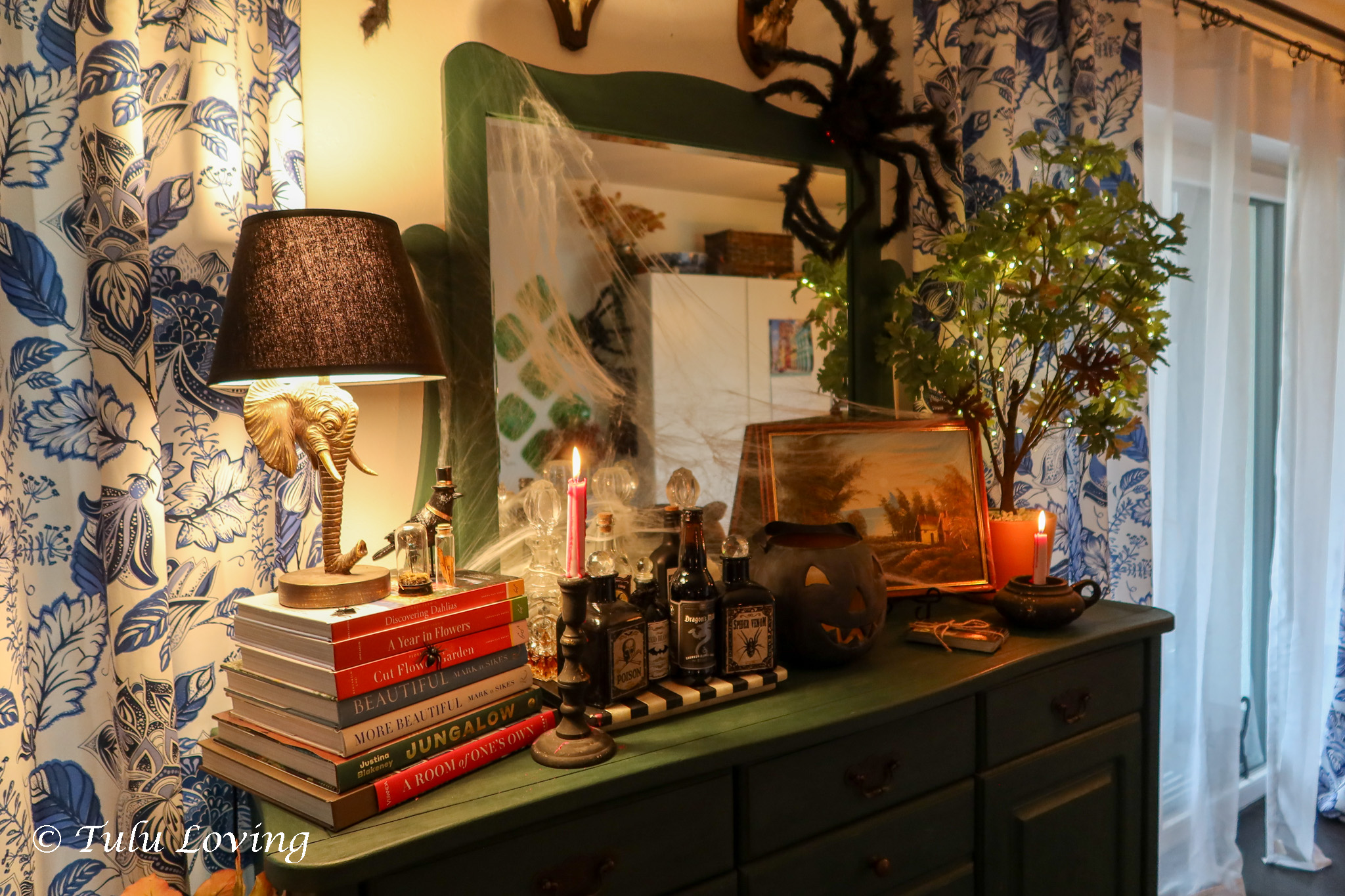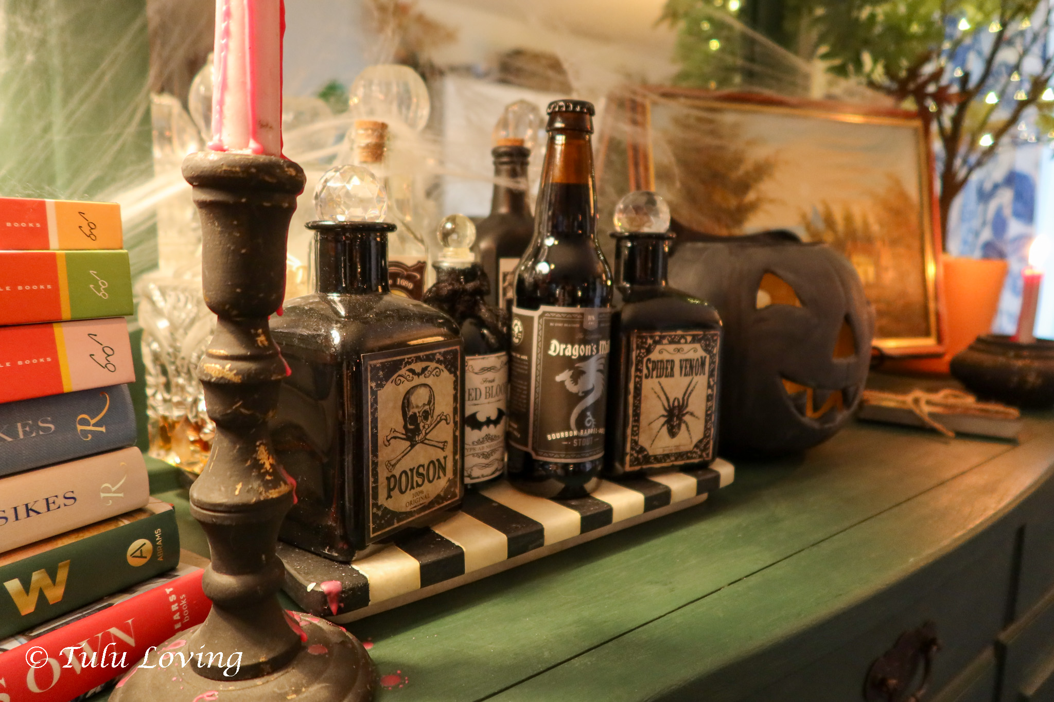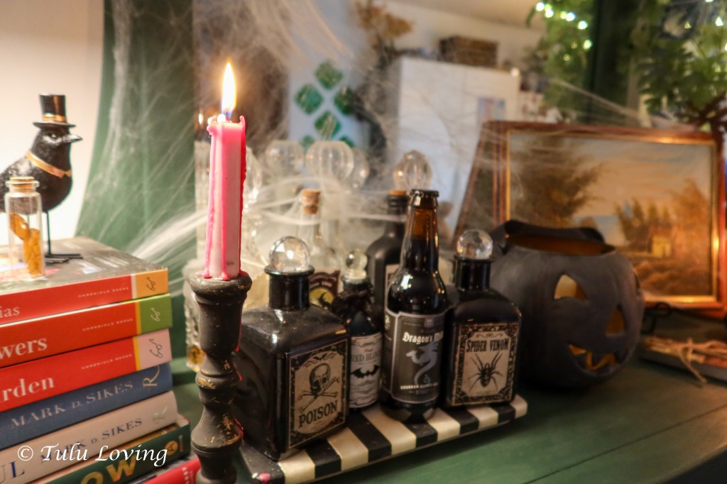 I added some fake potions and apothecary bottles to my usual decanters and made a spooky centerpiece for our dining table. The Lego Dobby was an impulse buy that I couldn’t resist!