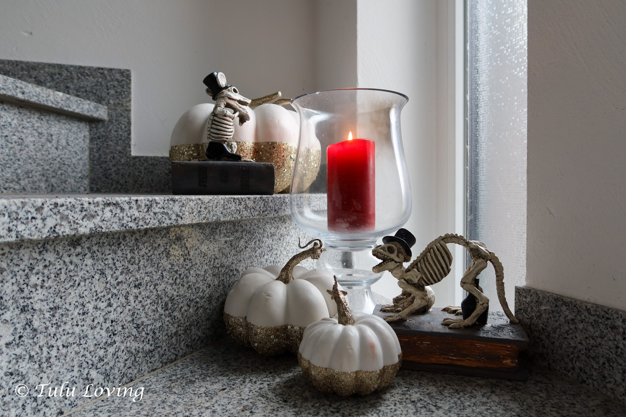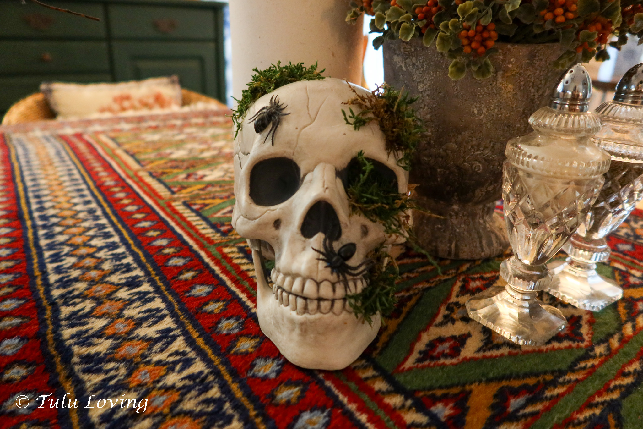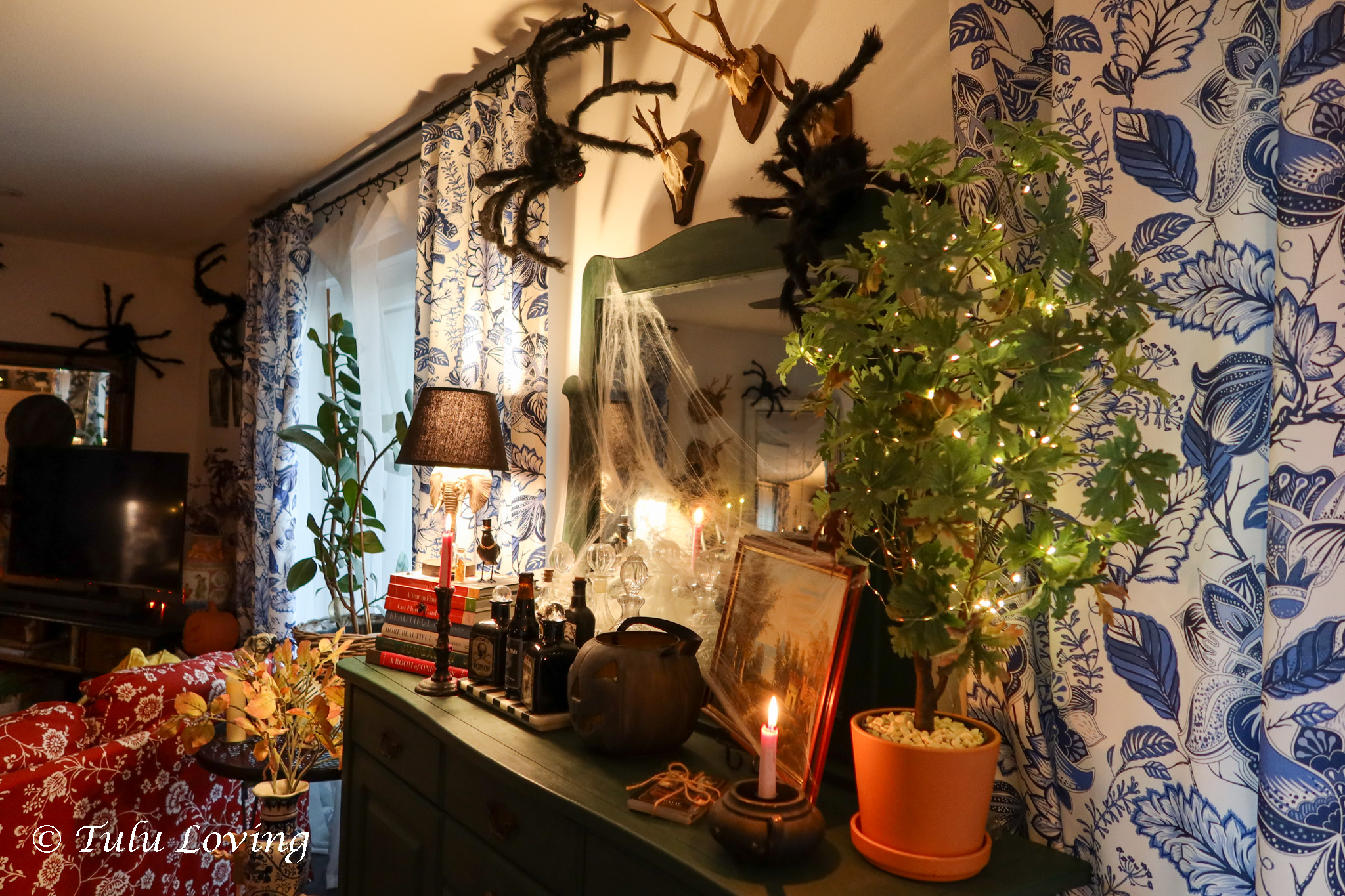 I added some fake potions and apothecary bottles to my usual decanters and made a spooky centerpiece for our dining table. The Lego Dobby was an impulse buy that I couldn’t resist!