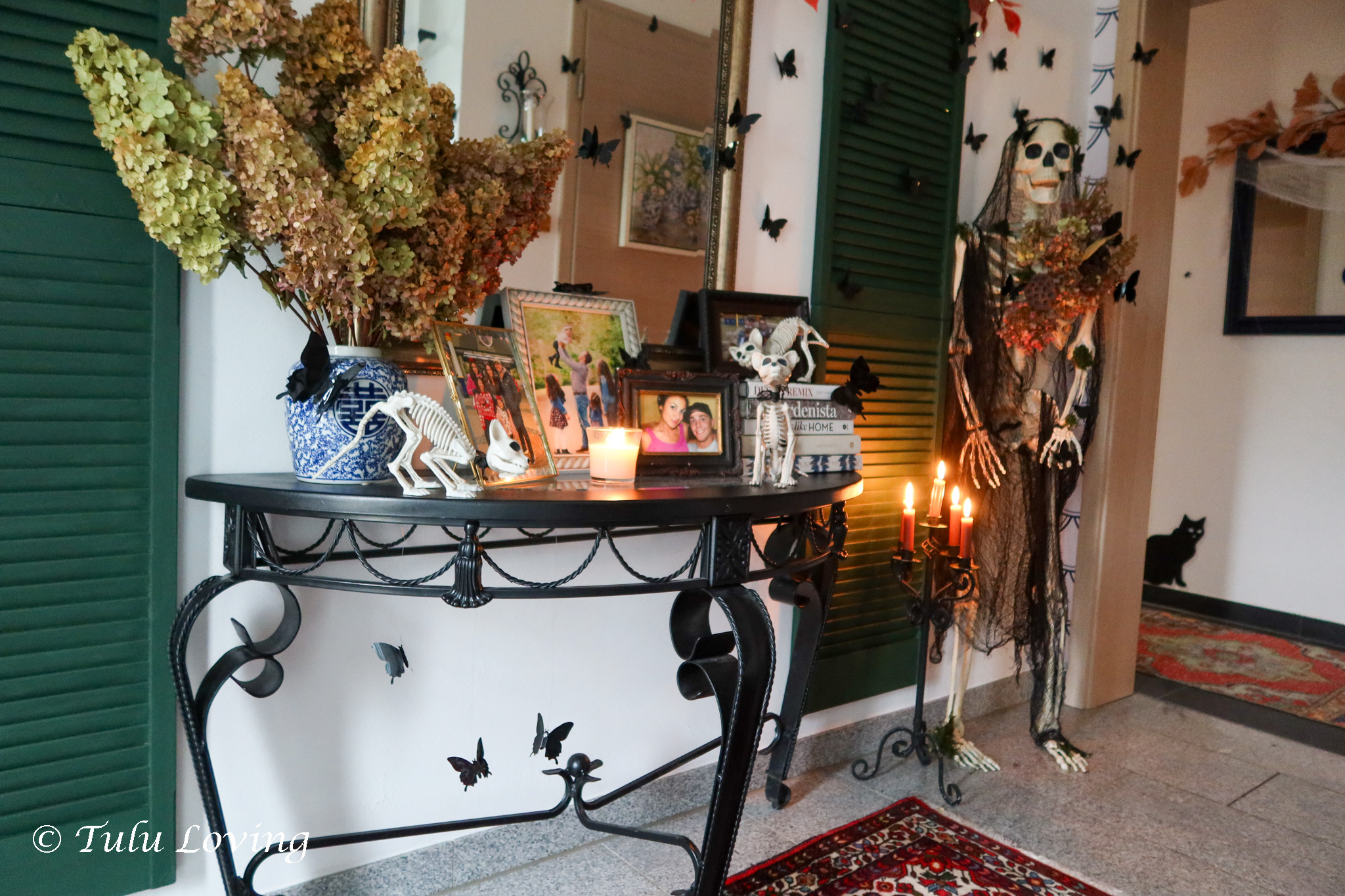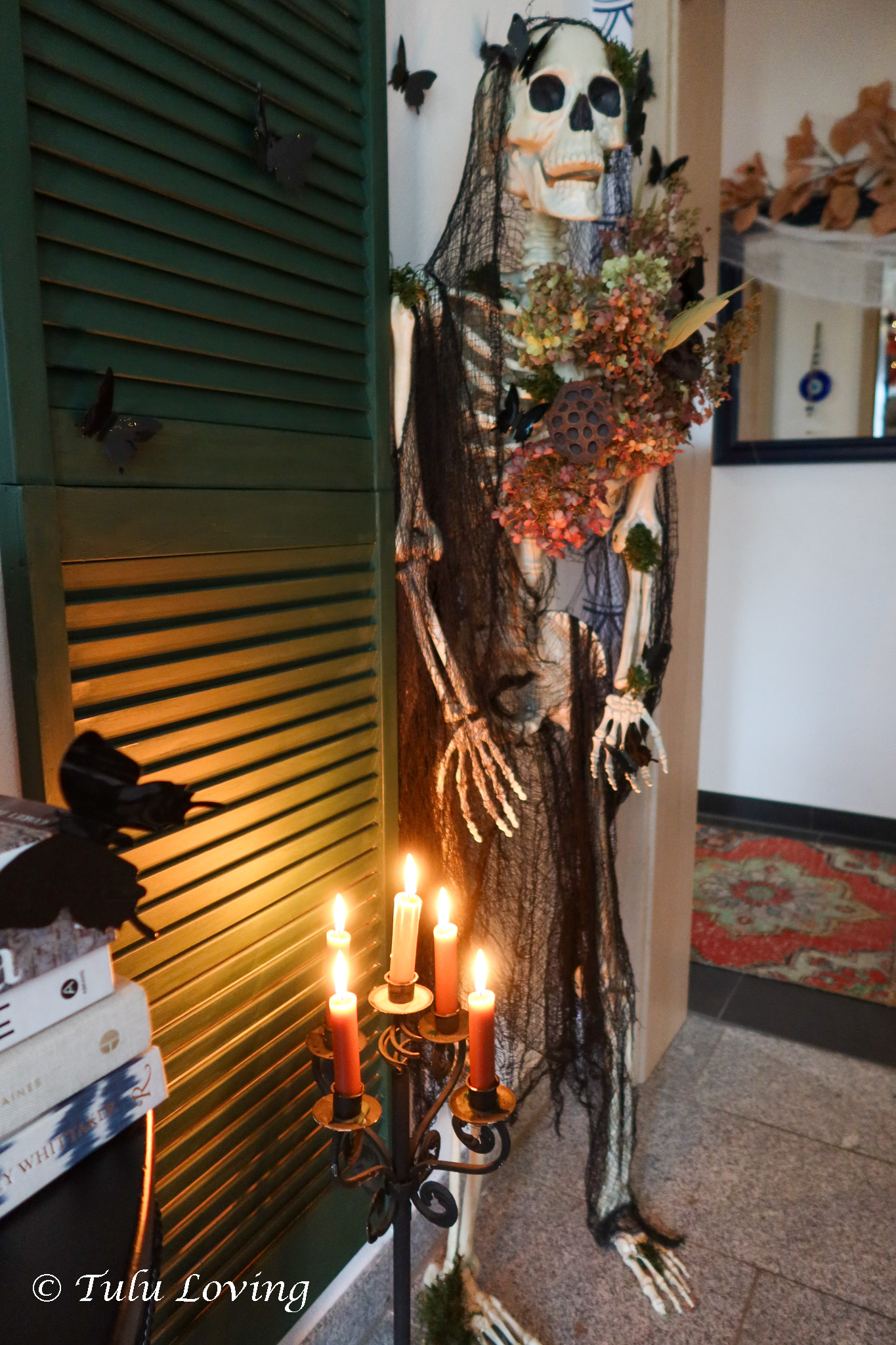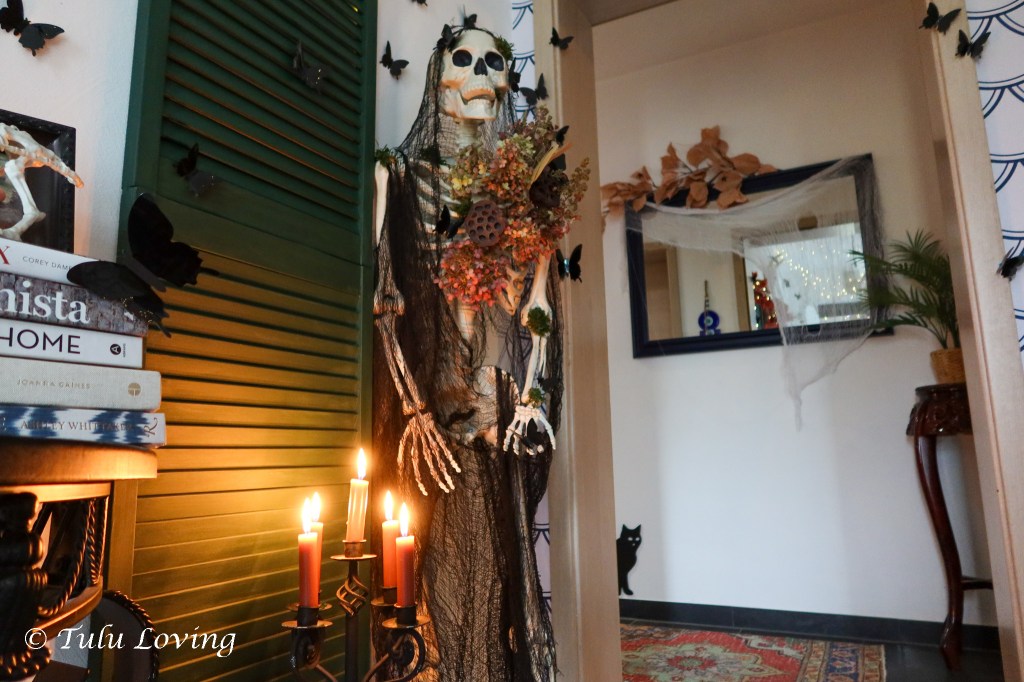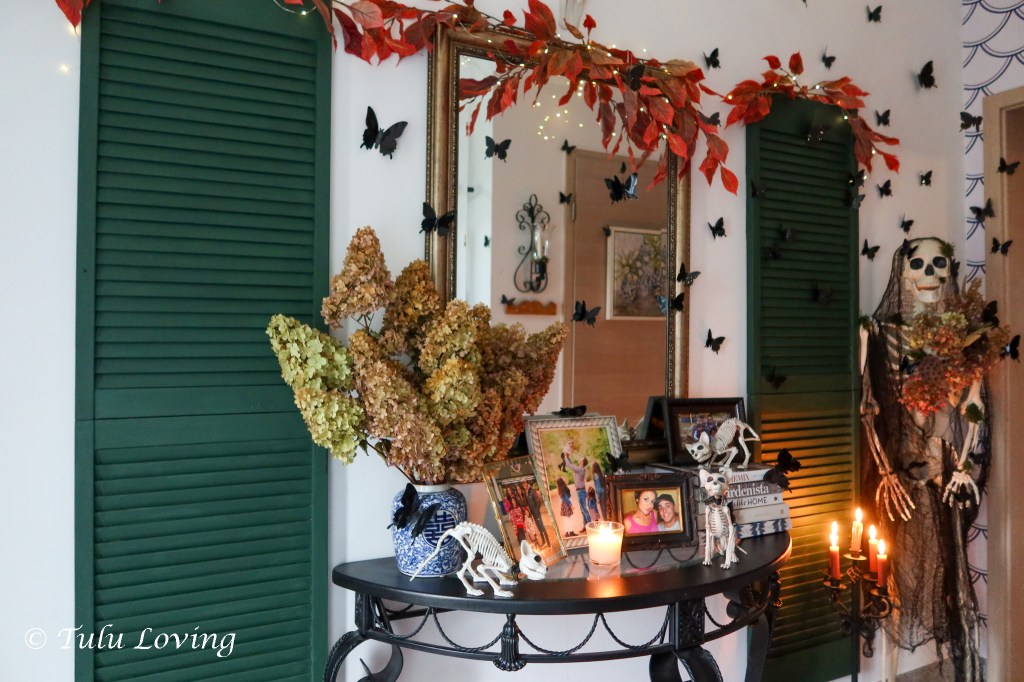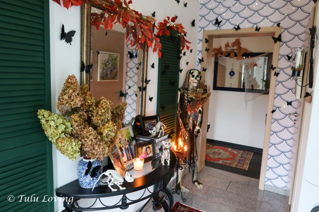 The entryway is covered in black butterflies that I ordered from Amazon last year. I’ve used an adhesive putty to attach them to the walls and objects and a few are hung with fishing wire hot glued to their backs and then tied to a command hook on the ceiling. My Walmart skeleton is adorned with dried flowers and creepy cloth. Battery twinkle lights are hung from the ceiling with adhesive putty as well.