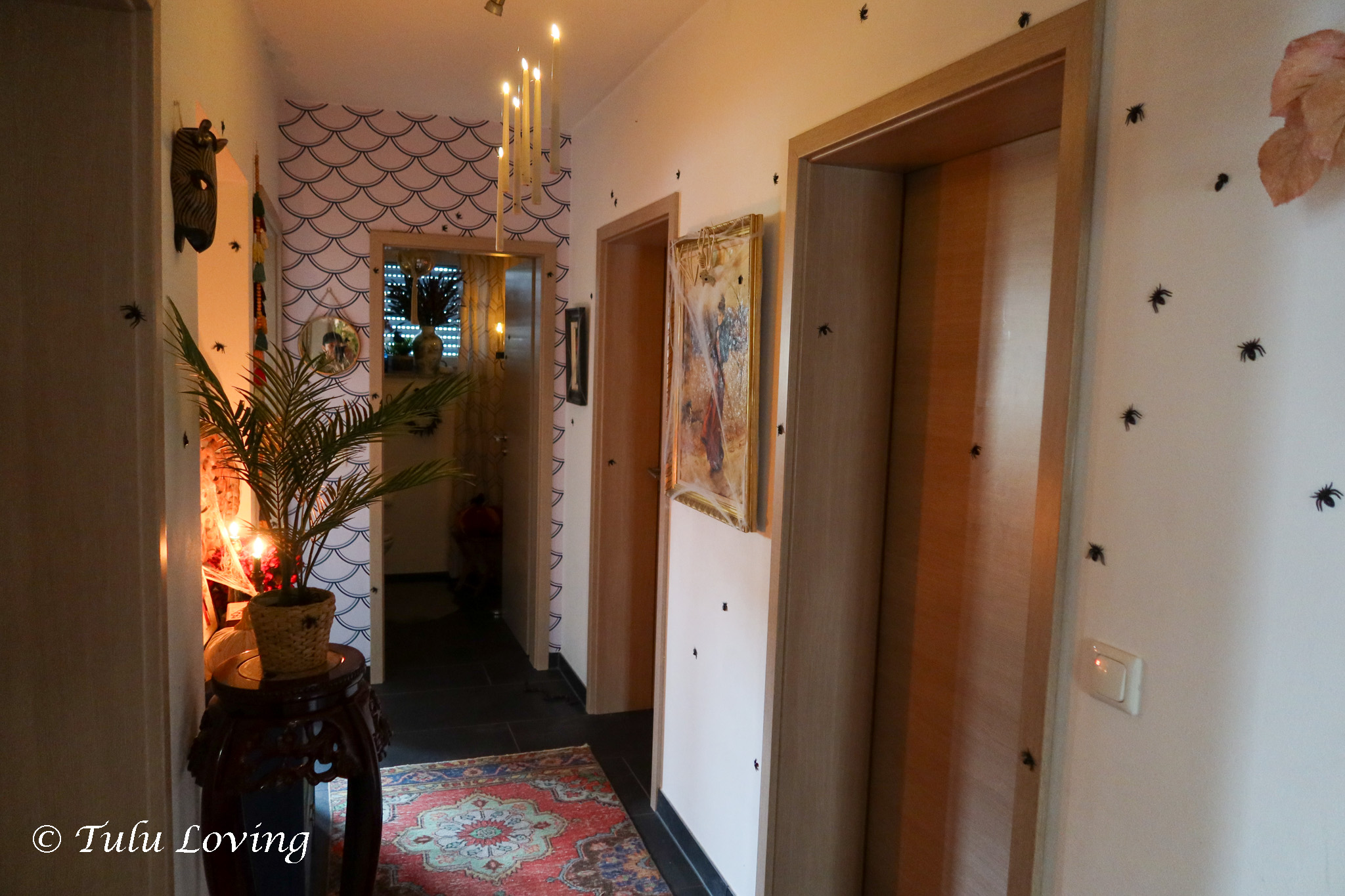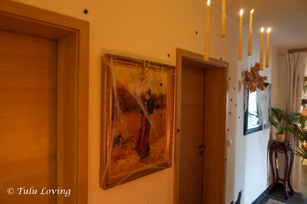 For the hallway, I added some fall stems, cheap plastic spiders, lots of cobwebs and some creepy cloth. I used fishing wire attached to our light fixture to hang the battery operated candles.