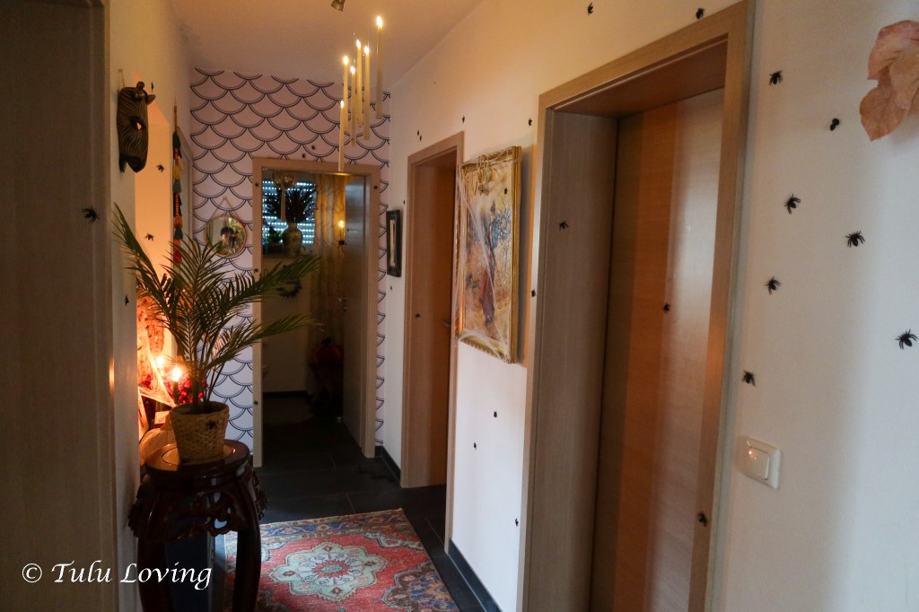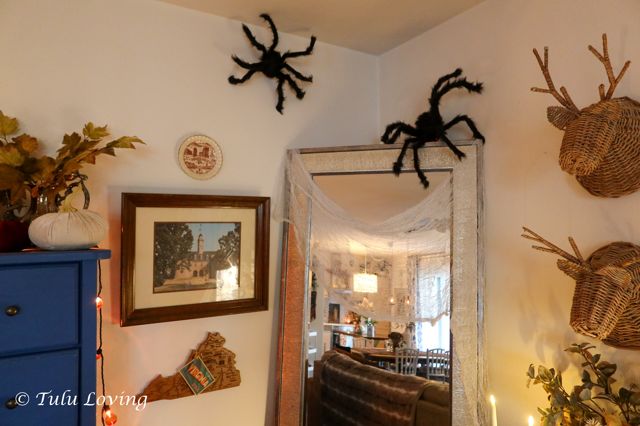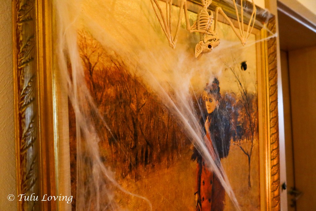 The main living areas are decorated with large spiders that are meant for outdoor decorating. I thought they would look so cool crawling around our walls. I used command hooks and more fishing wire to hang them.